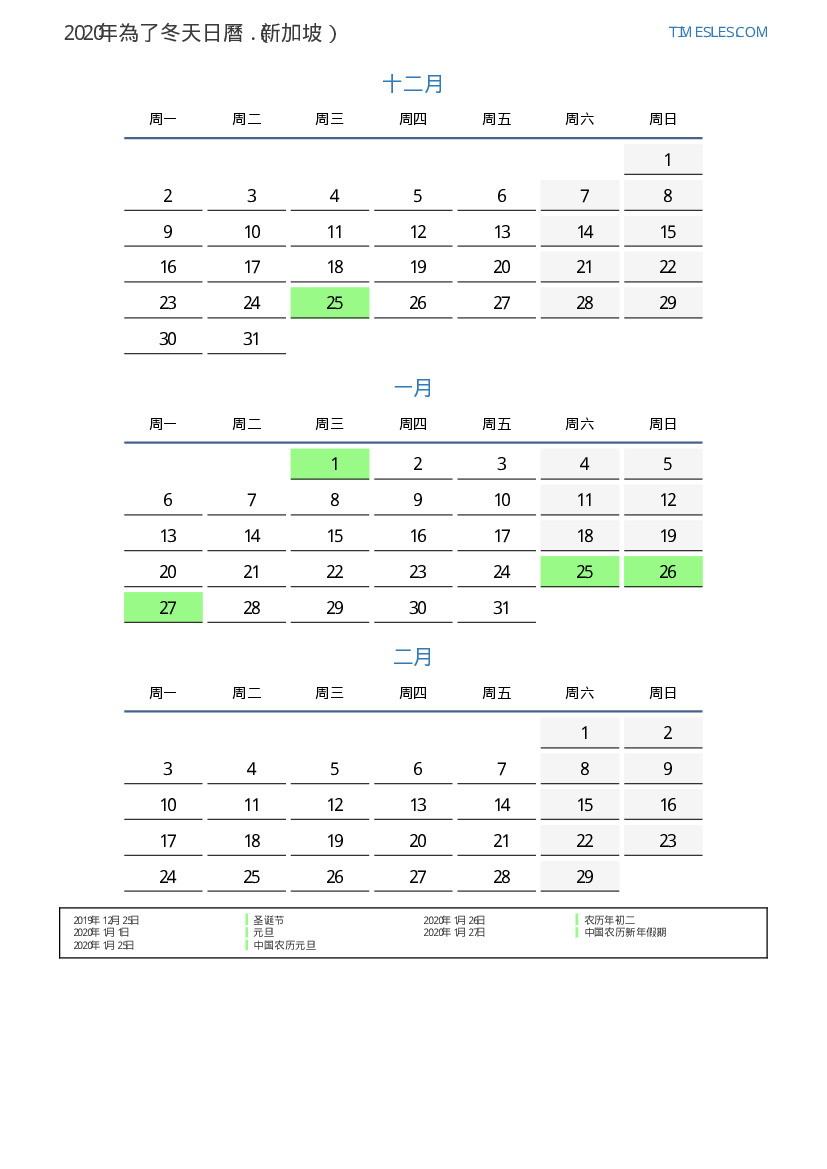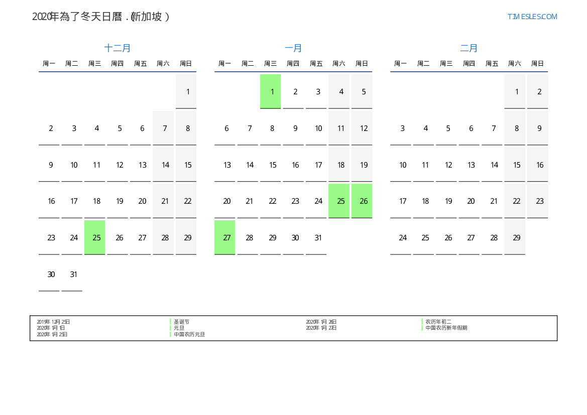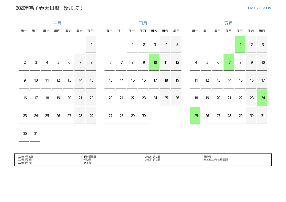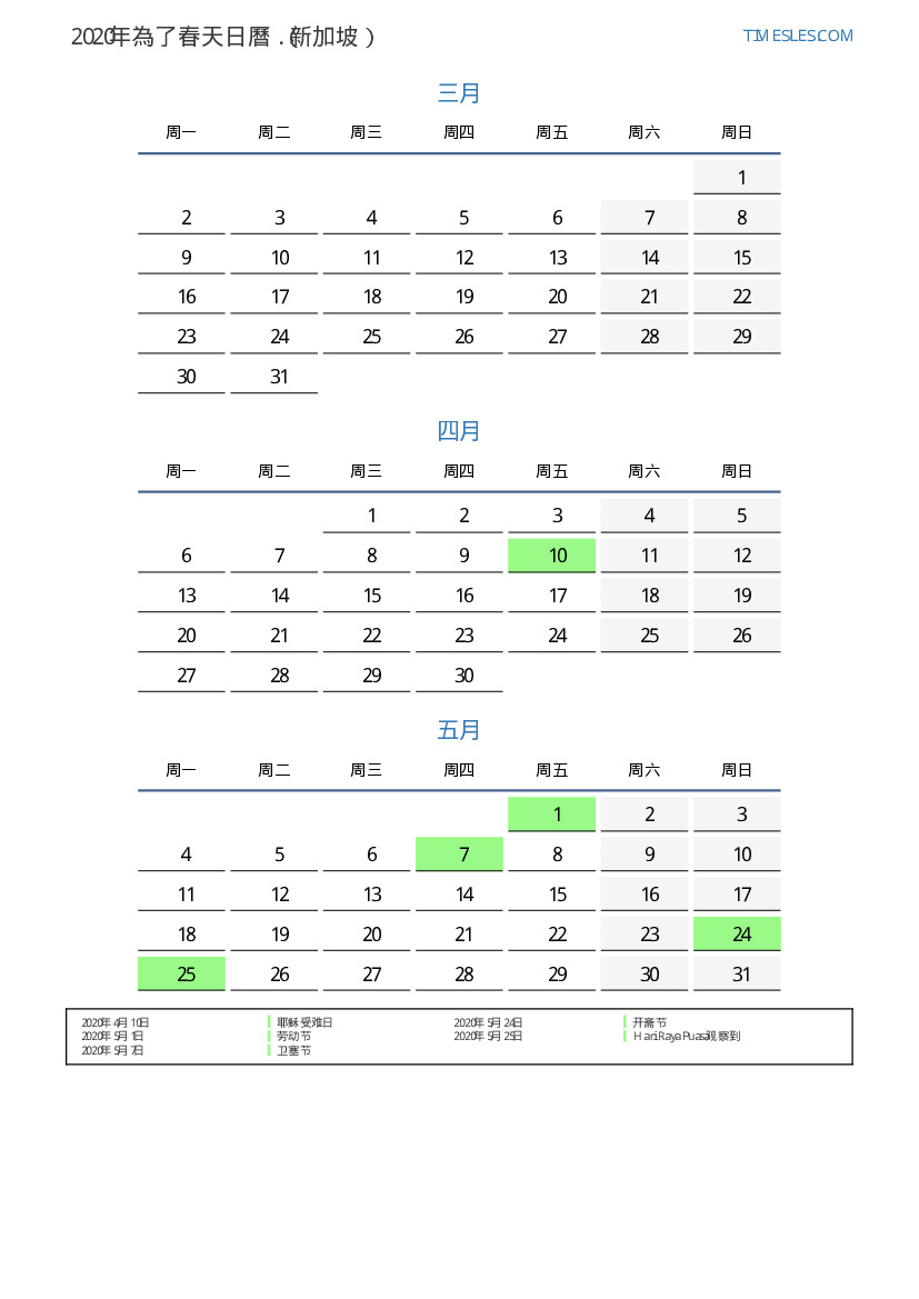 对于新加坡下載並打印2020年為了春天假期和周末的PDF日曆