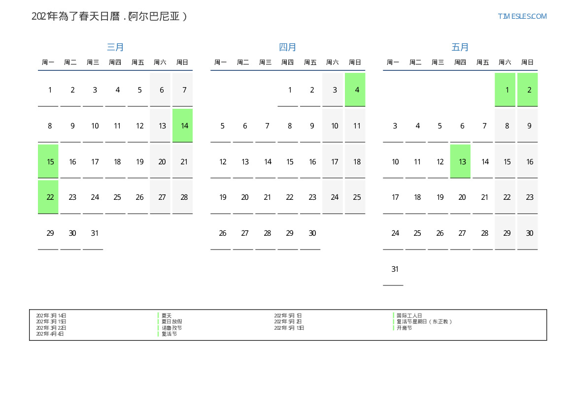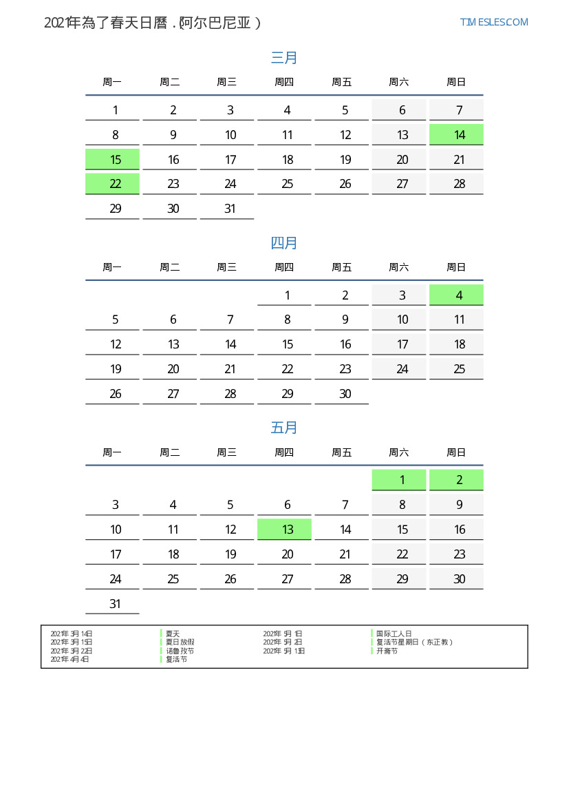 阿尔巴尼亚2021年為了春天假期和周末的日曆