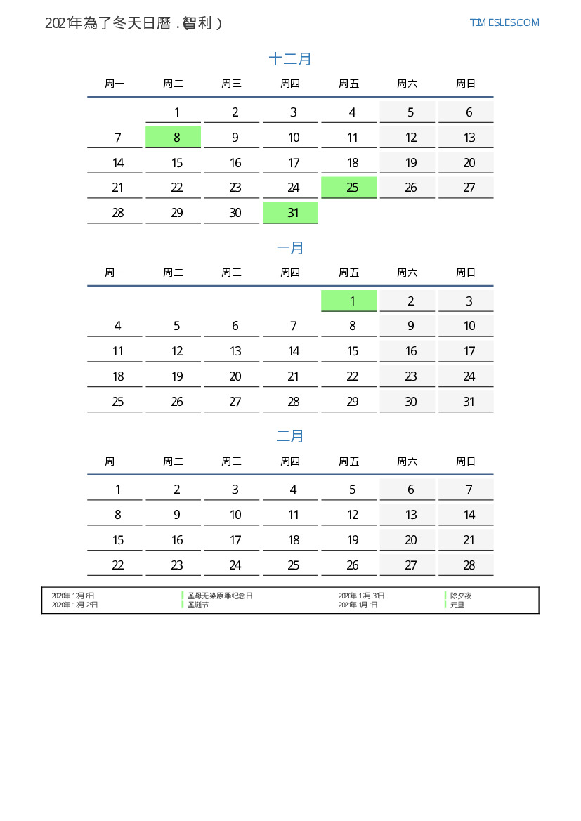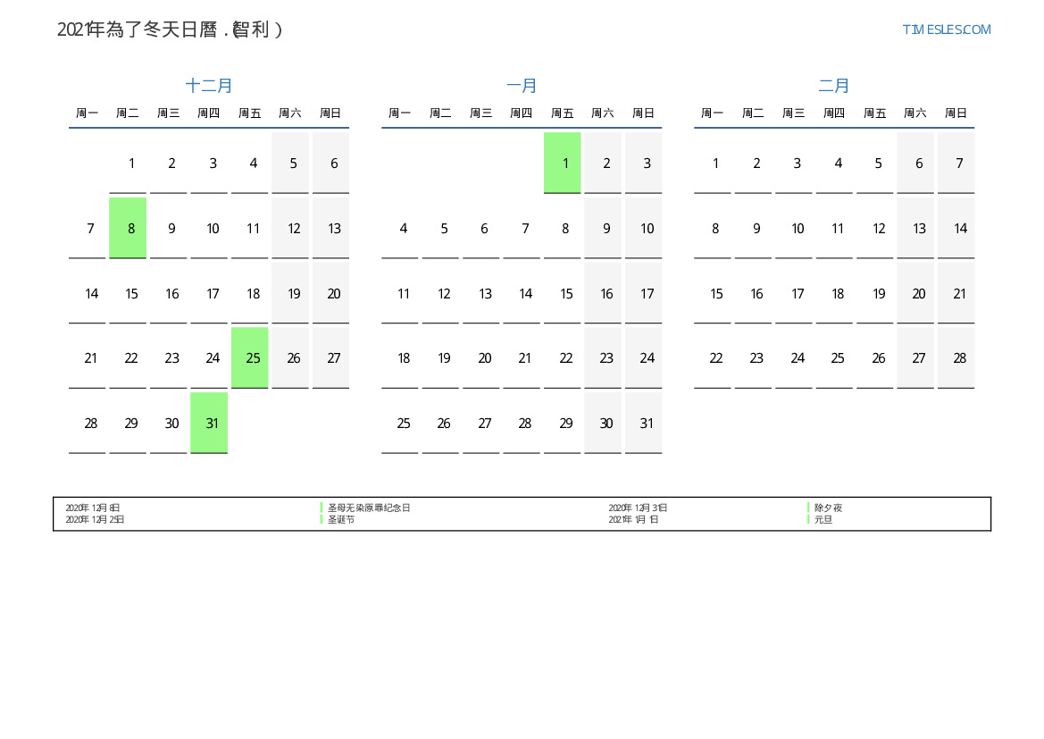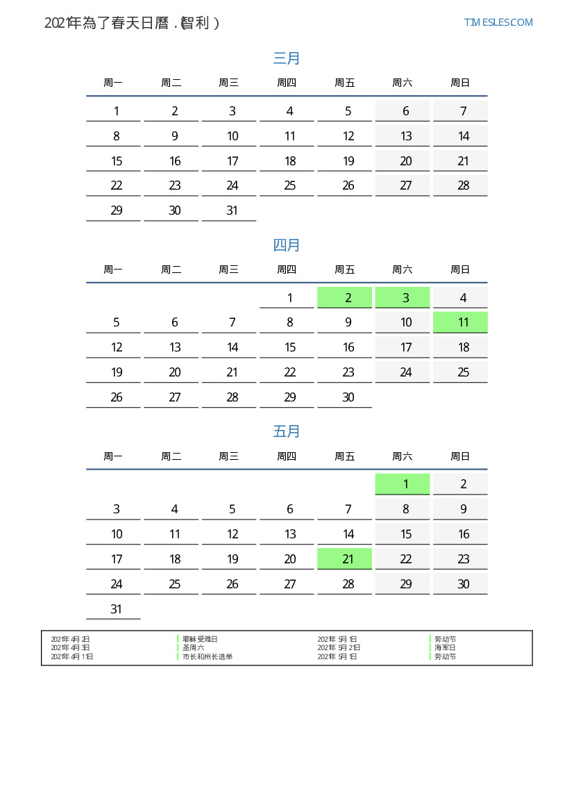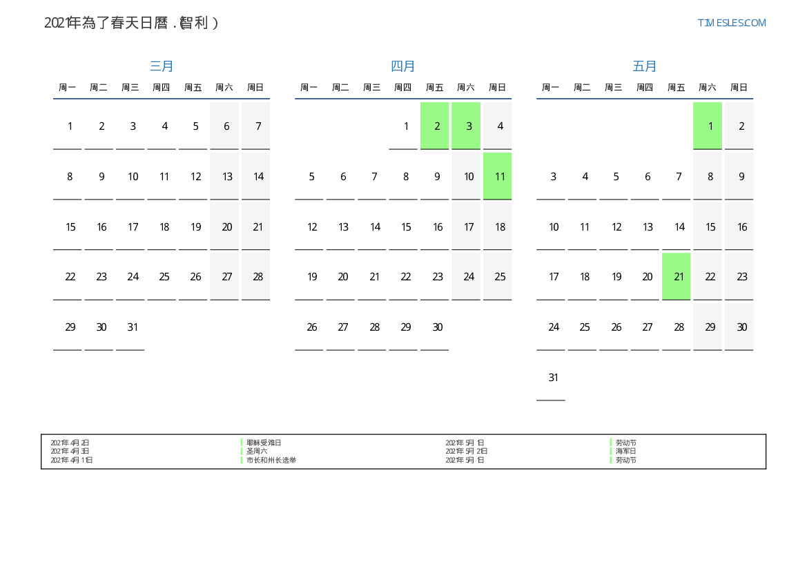 智利下載並打印2021年為了春天假期和周末的PDF日曆