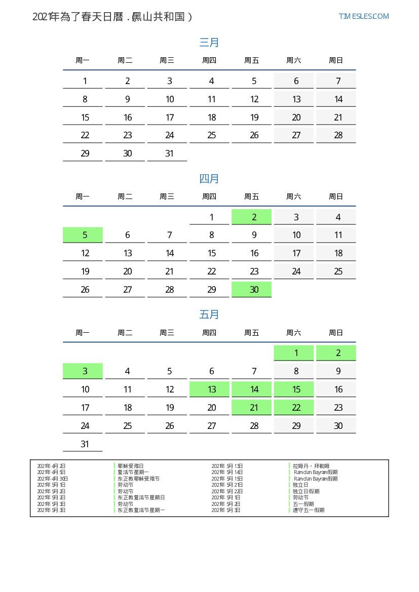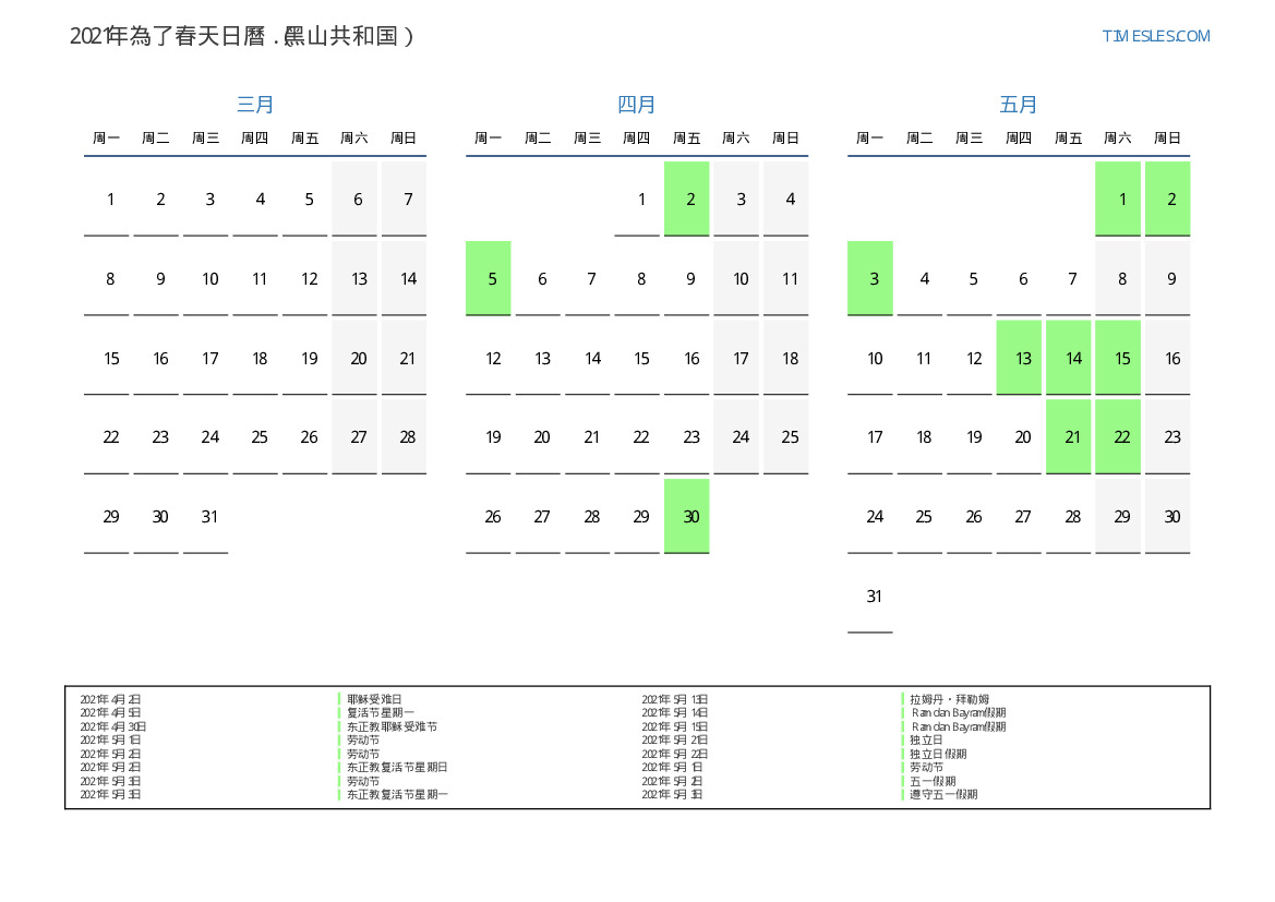 黑山共和国2021年為了春天假期和周末的日曆