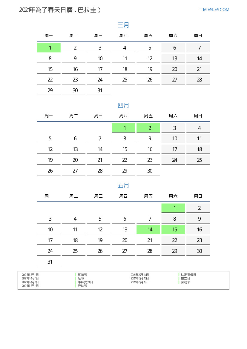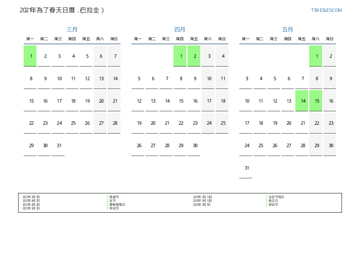 巴拉圭下載並打印2021年為了春天假期和周末的PDF日曆
