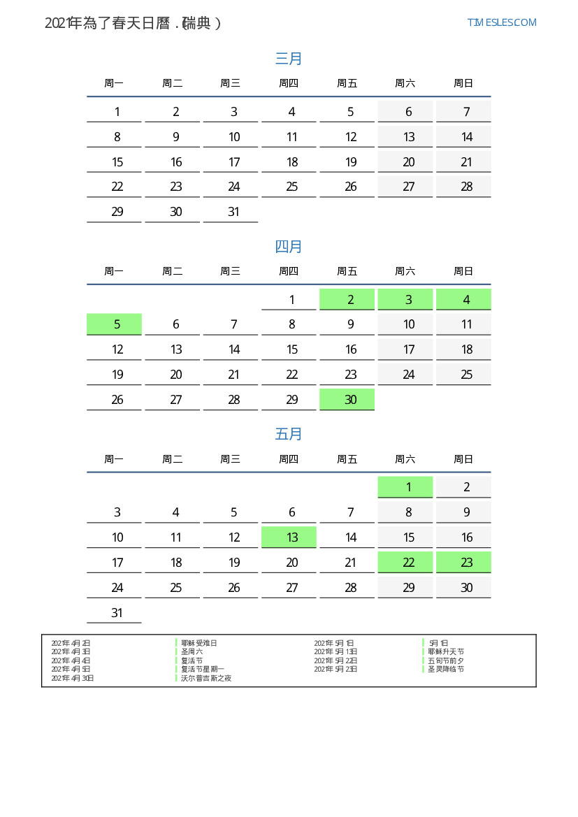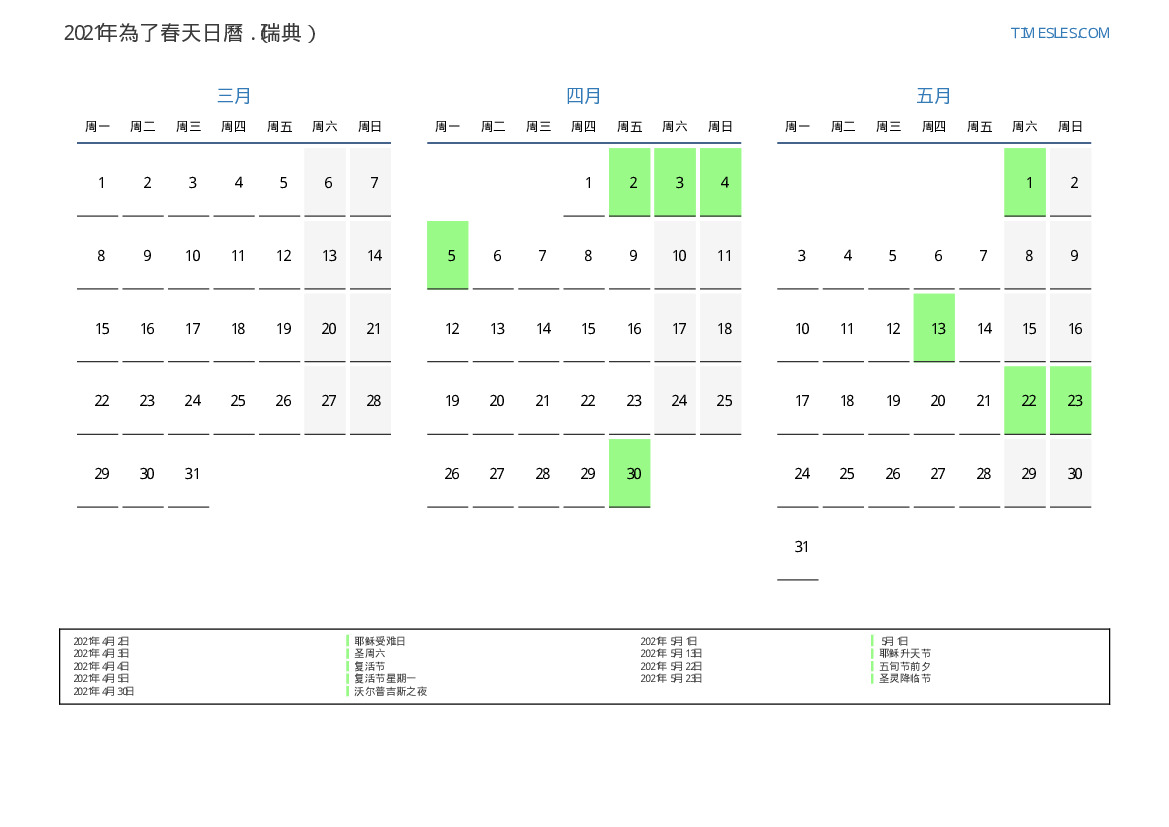 瑞典下載並打印2021年為了春天假期和周末的PDF日曆
