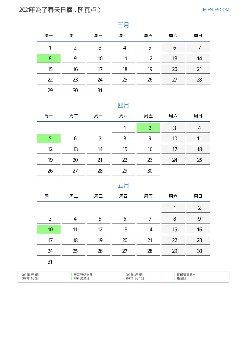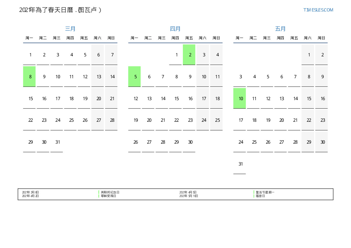 对于图瓦卢下載並打印2021年為了春天假期和周末的PDF日曆