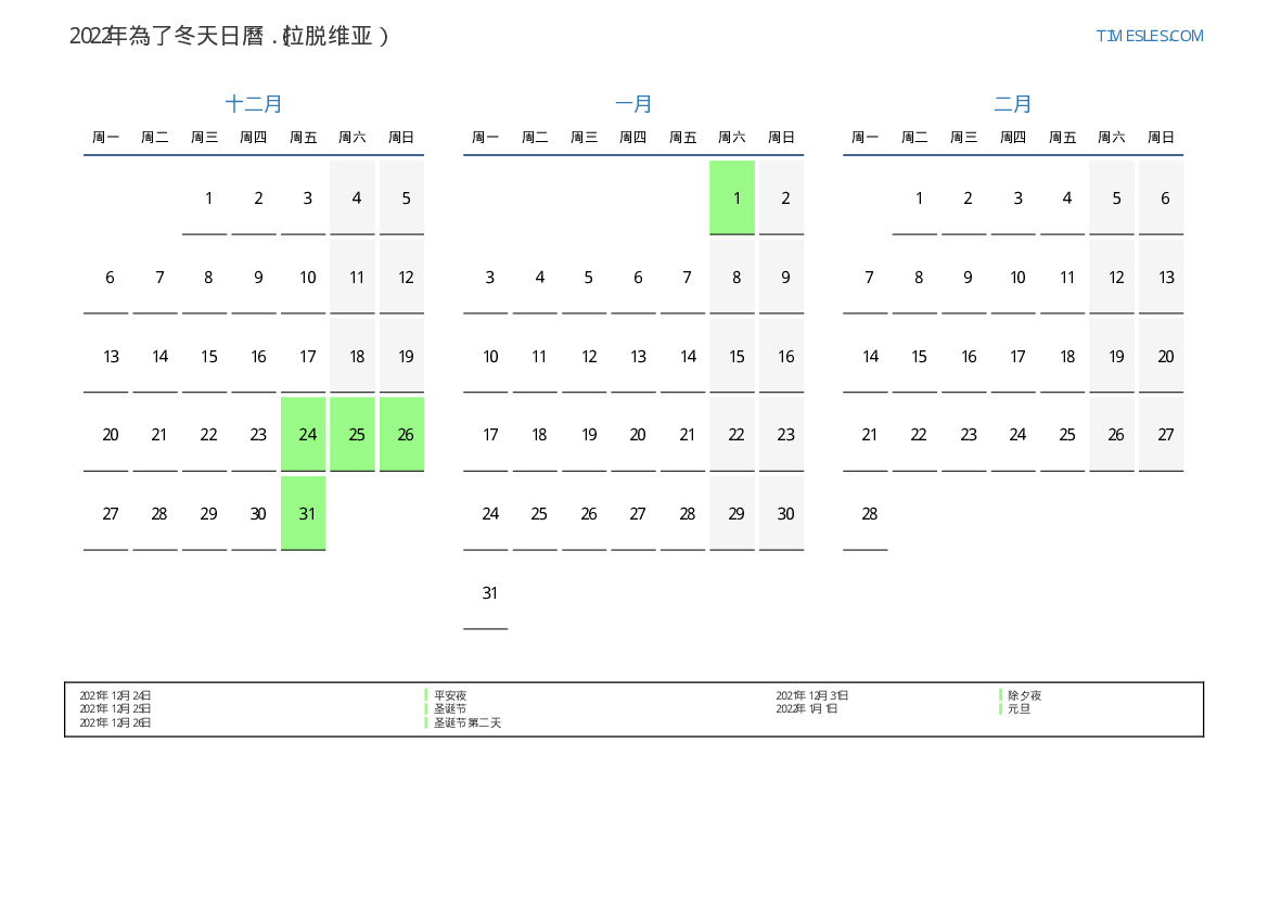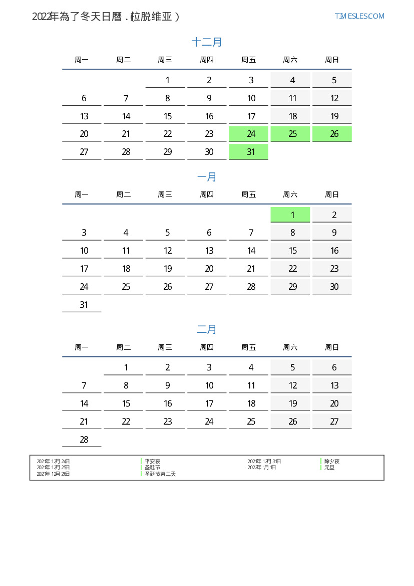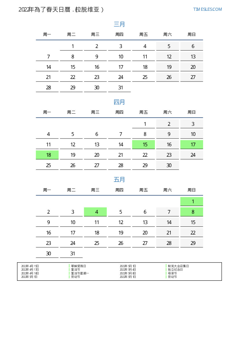 拉脱维亚下載並打印2022年為了春天假期和周末的PDF日曆