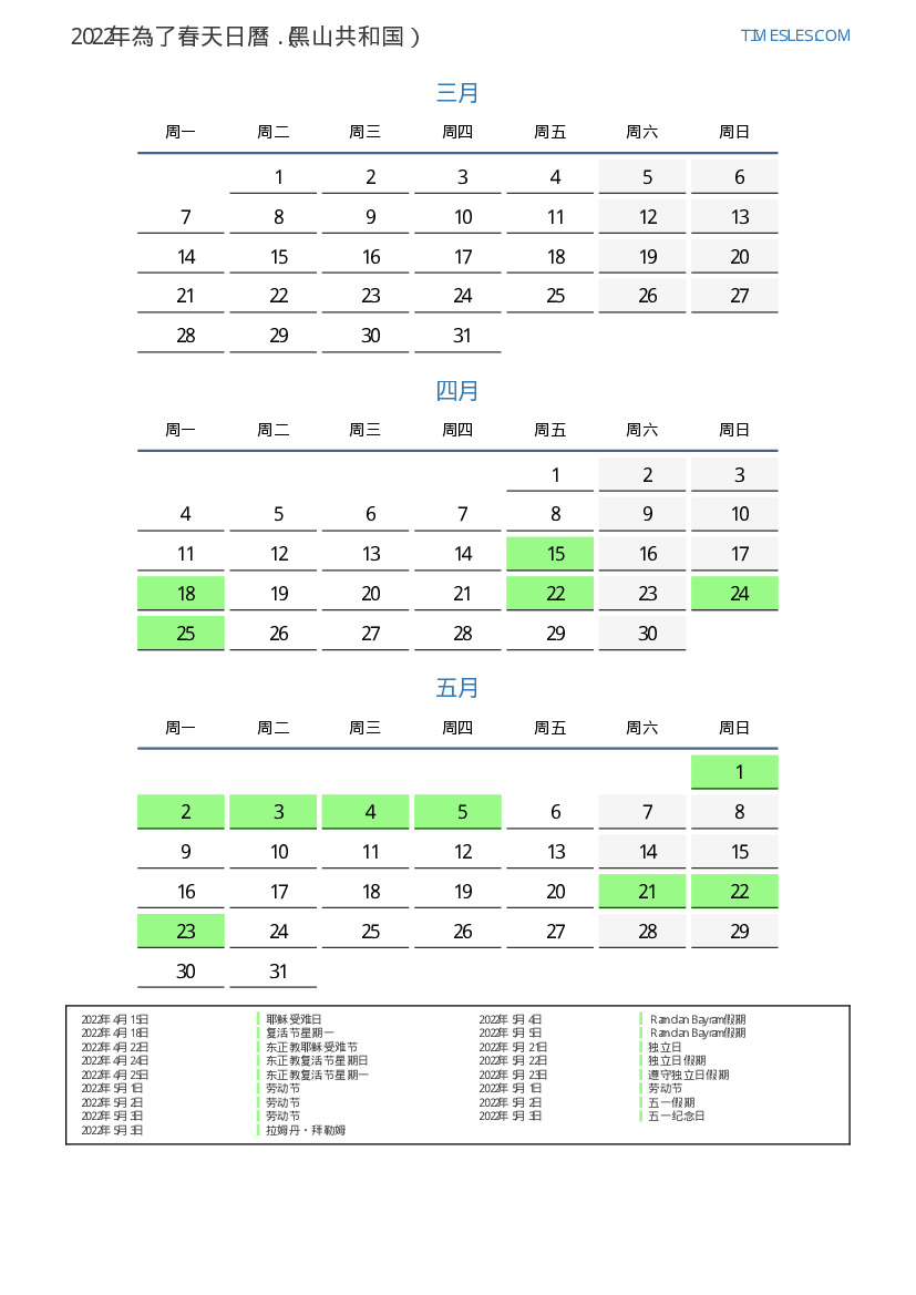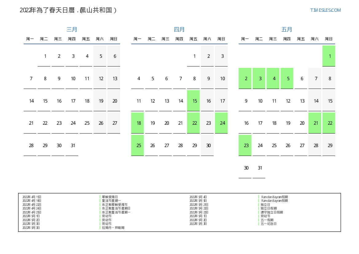 黑山共和国下載並打印2022年為了春天假期和周末的PDF日曆