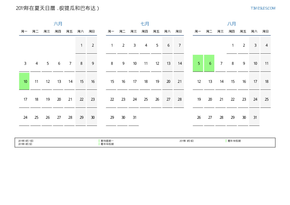 安提瓜和巴布达2019年在夏天假期和周末的日曆