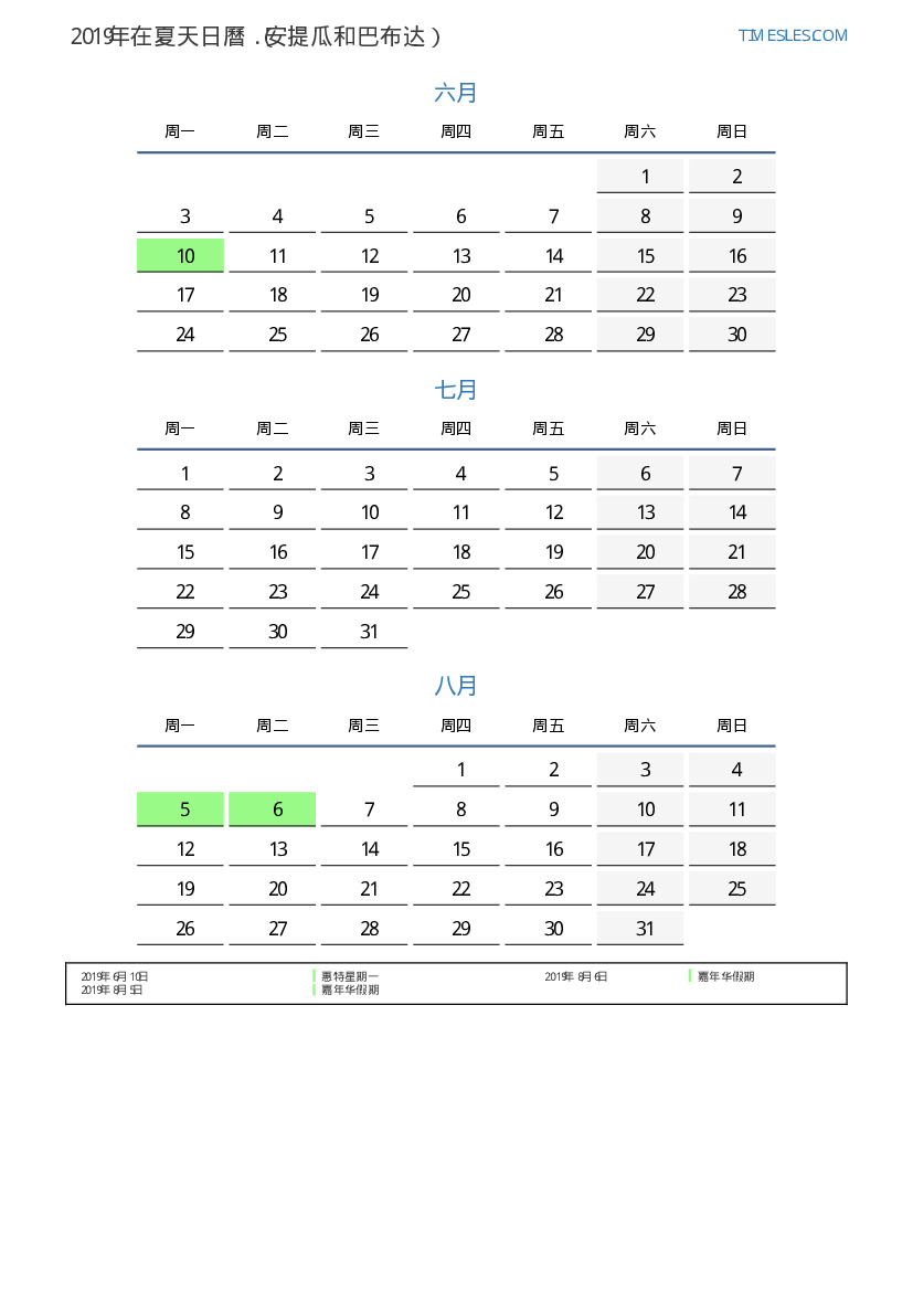 安提瓜和巴布达下載並打印2019年在夏天假期和周末的PDF日曆