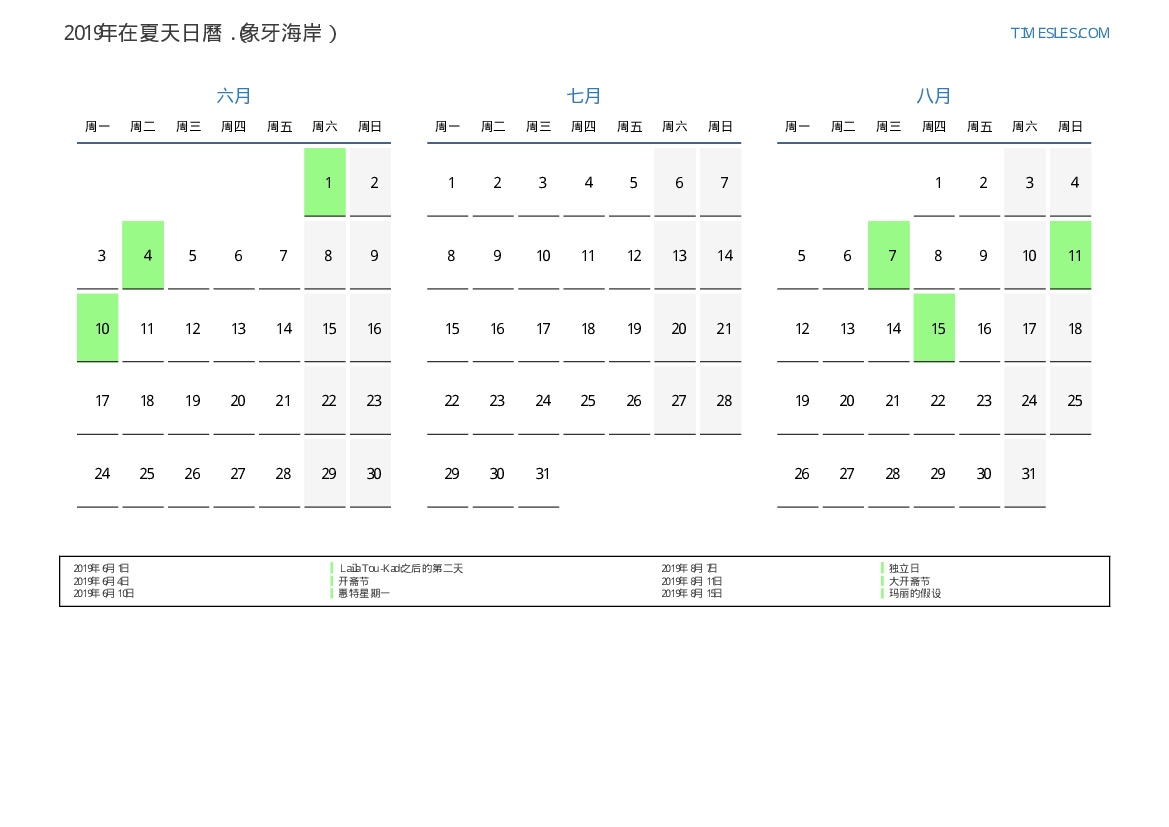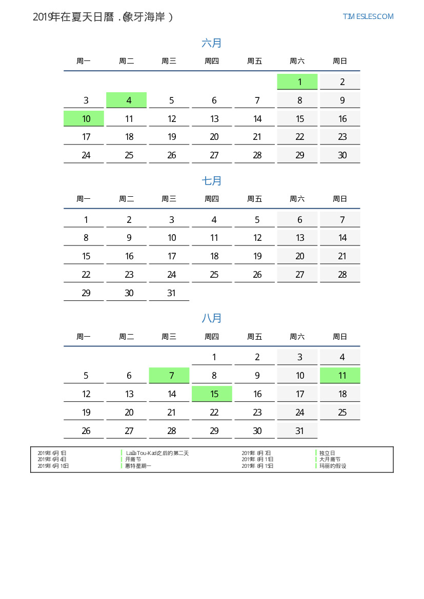 科特迪瓦下載並打印2019年在夏天假期和周末的PDF日曆