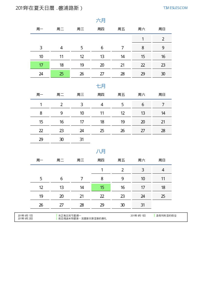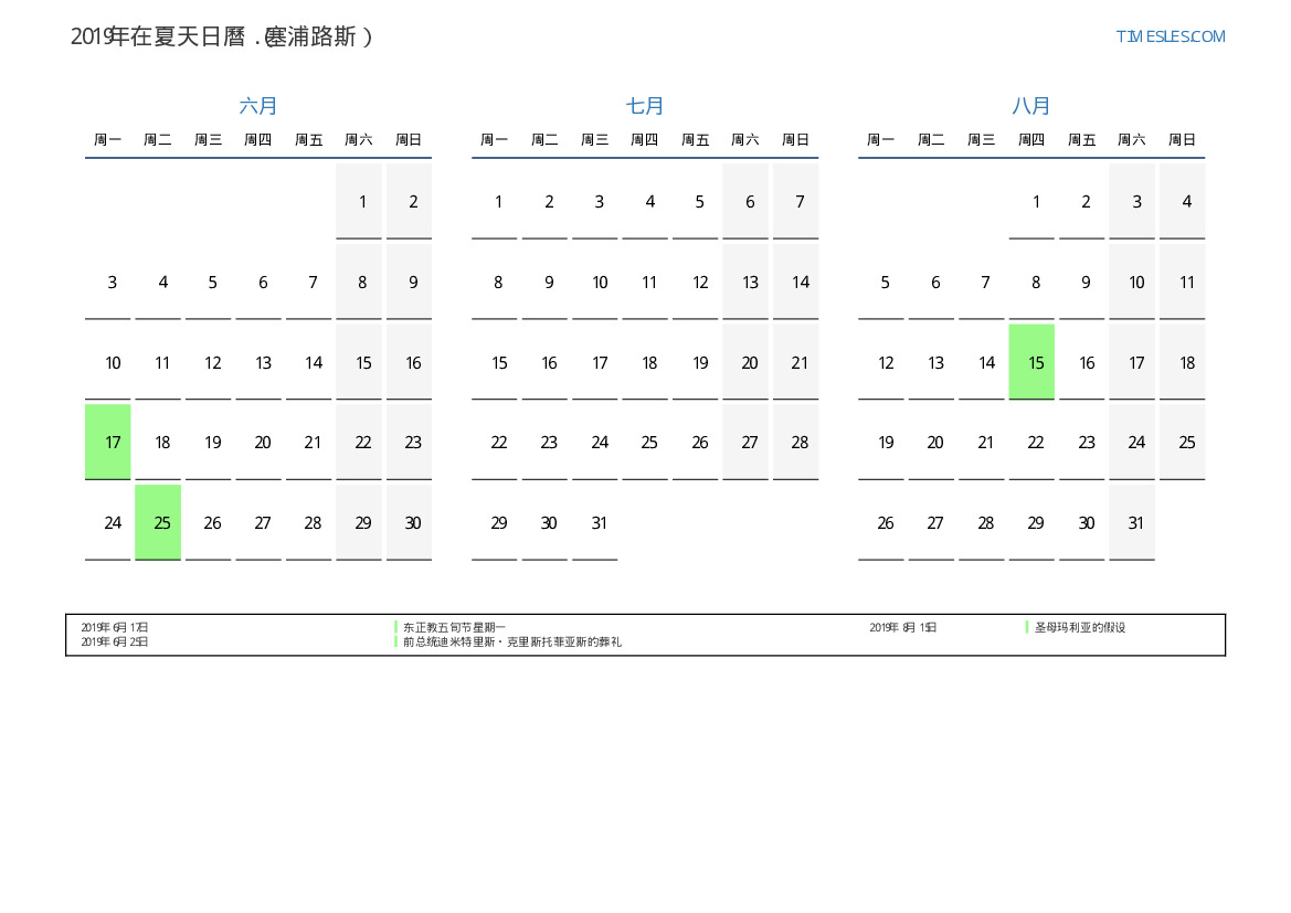 塞浦路斯下載並打印2019年在夏天假期和周末的PDF日曆