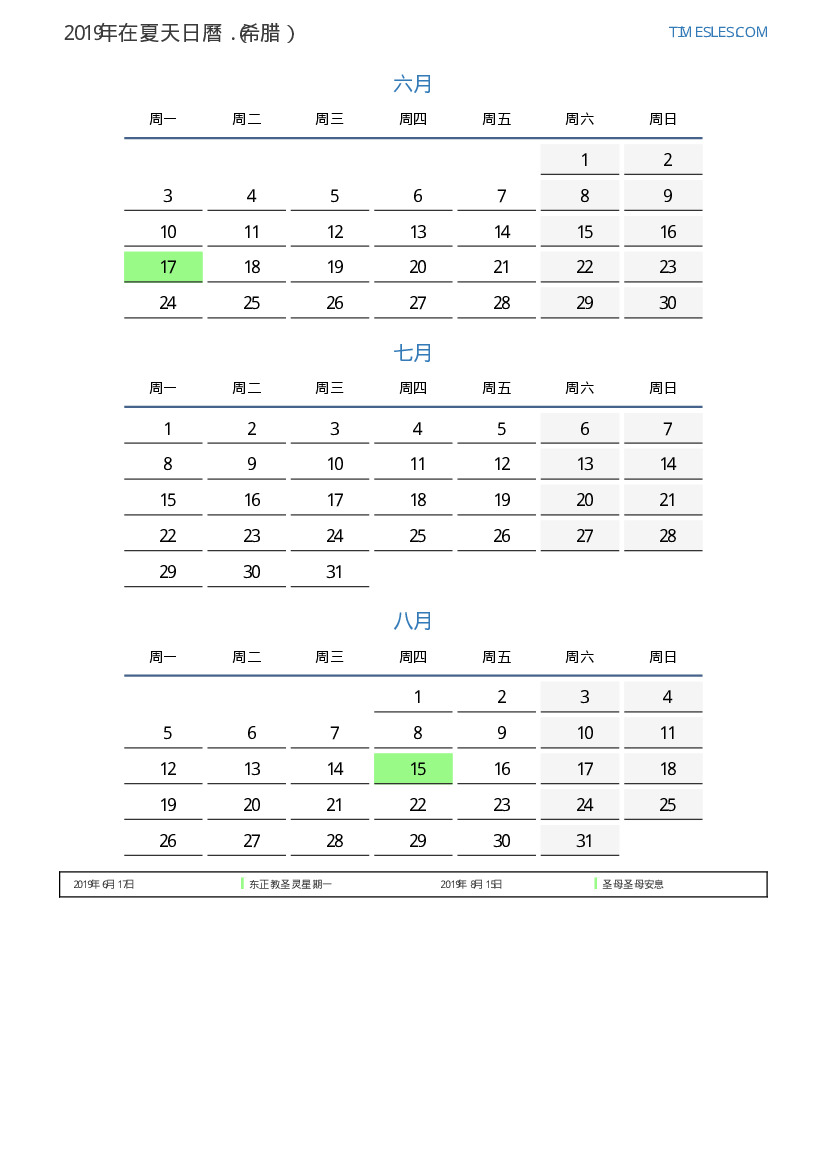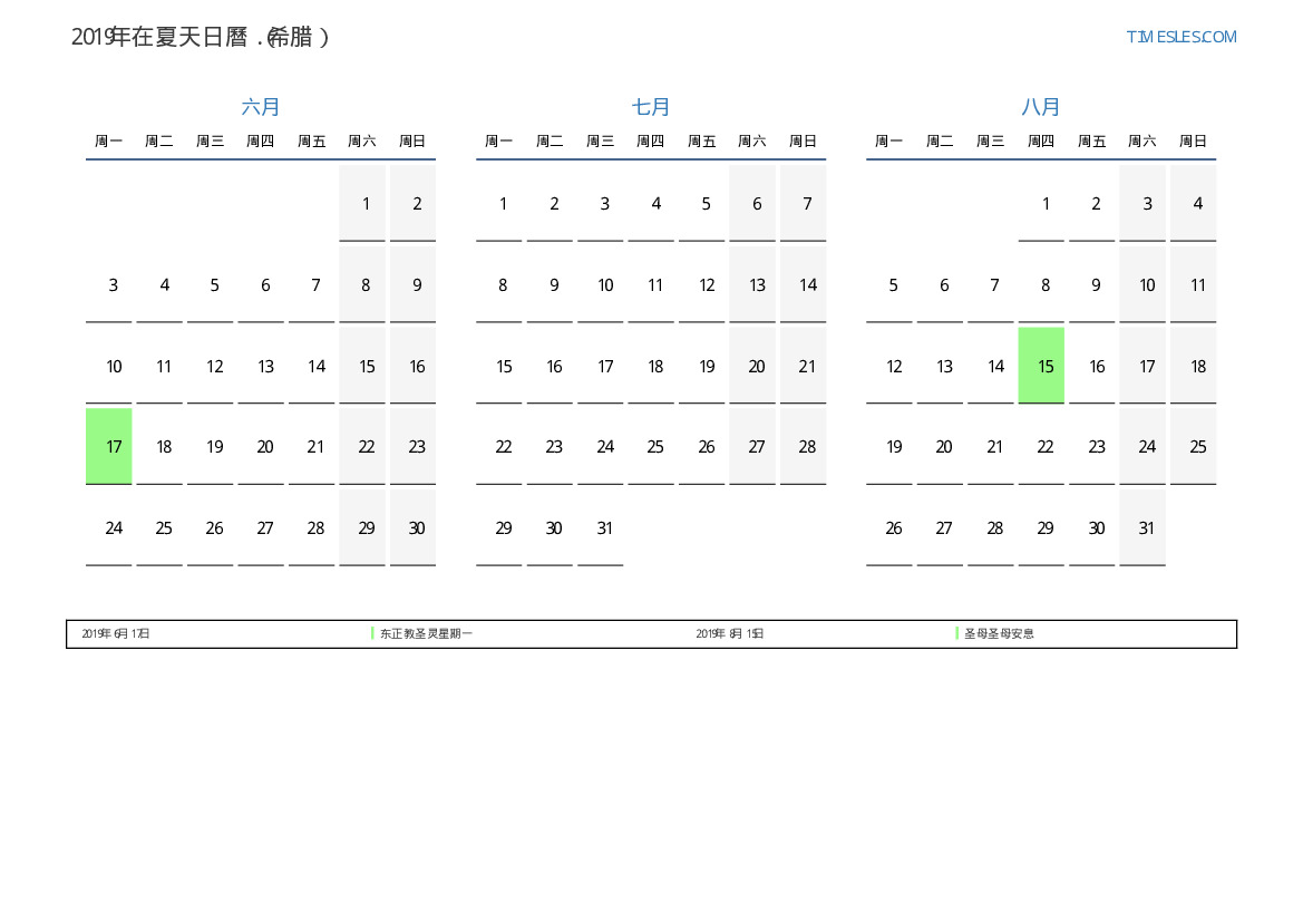 对于希腊2019年在夏天日曆