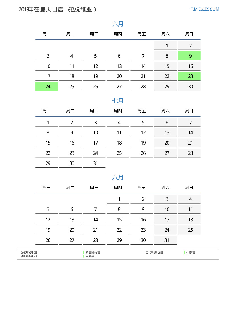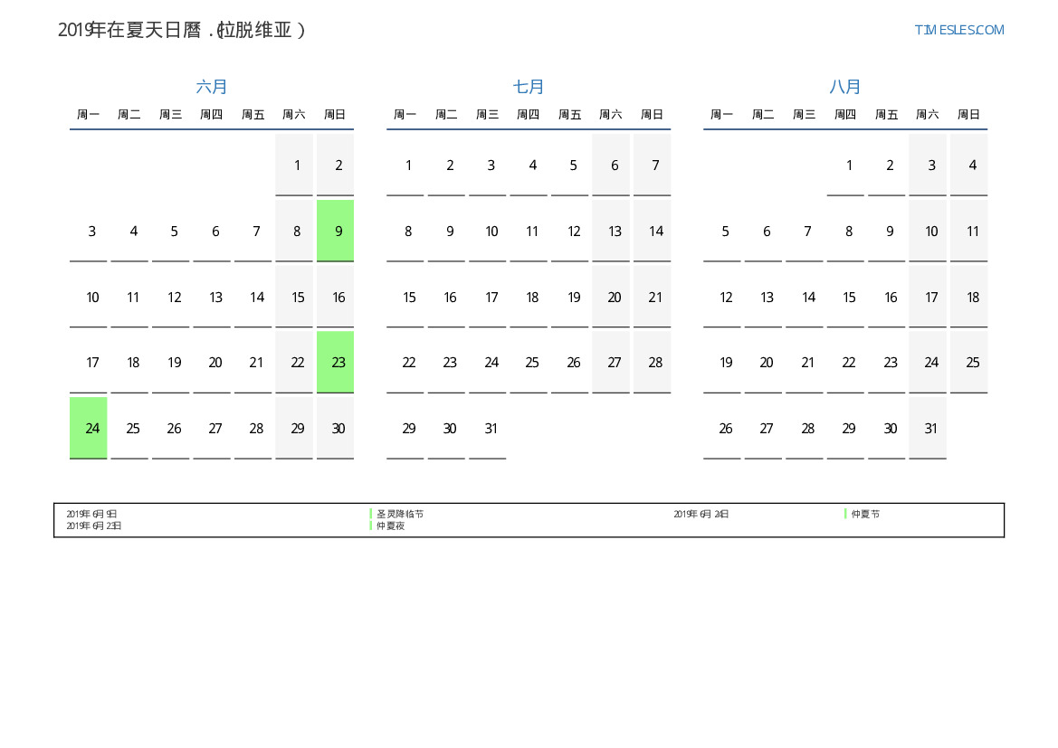 拉脱维亚下載並打印2019年在夏天假期和周末的PDF日曆