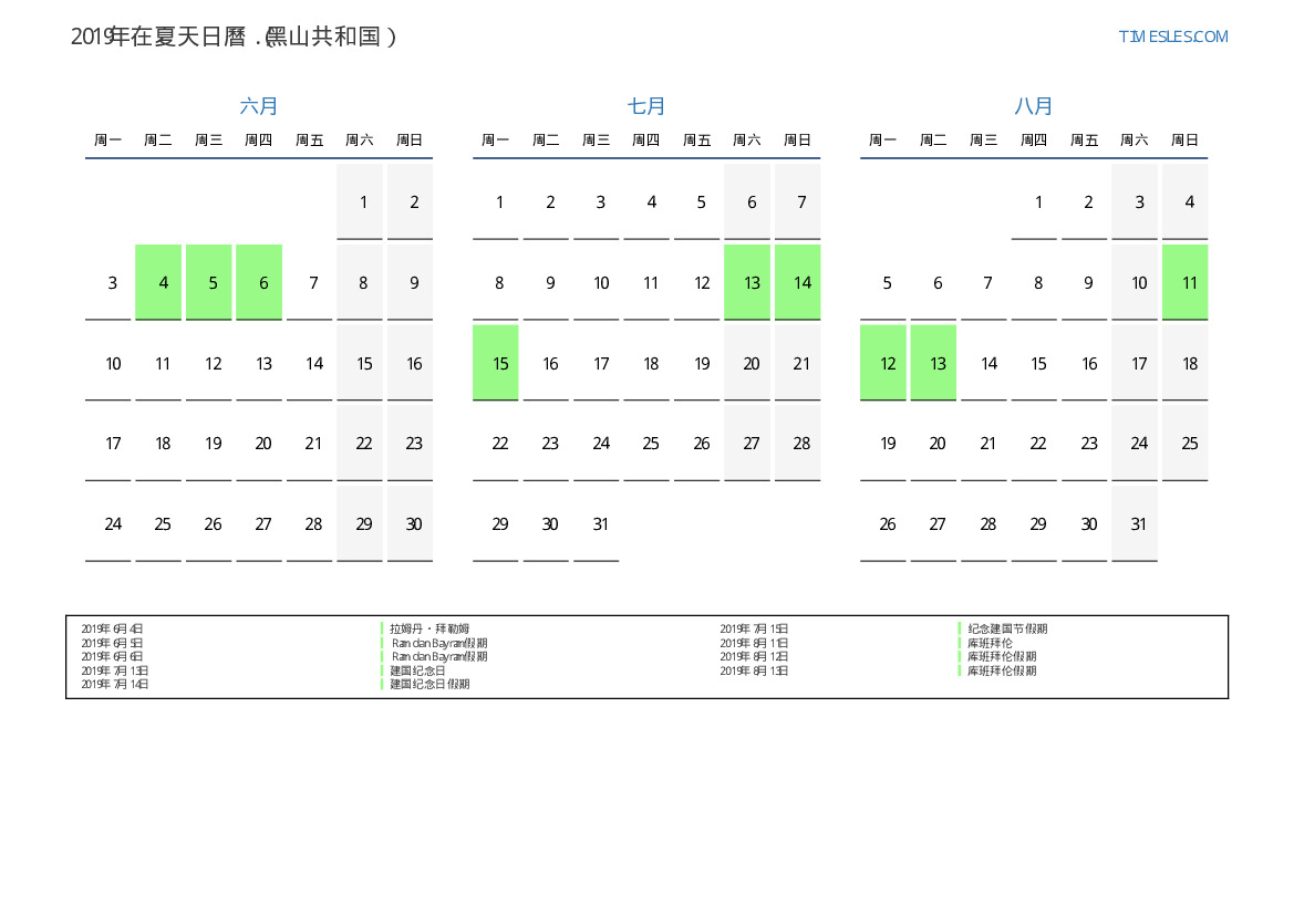 黑山共和国下載並打印2019年在夏天假期和周末的PDF日曆