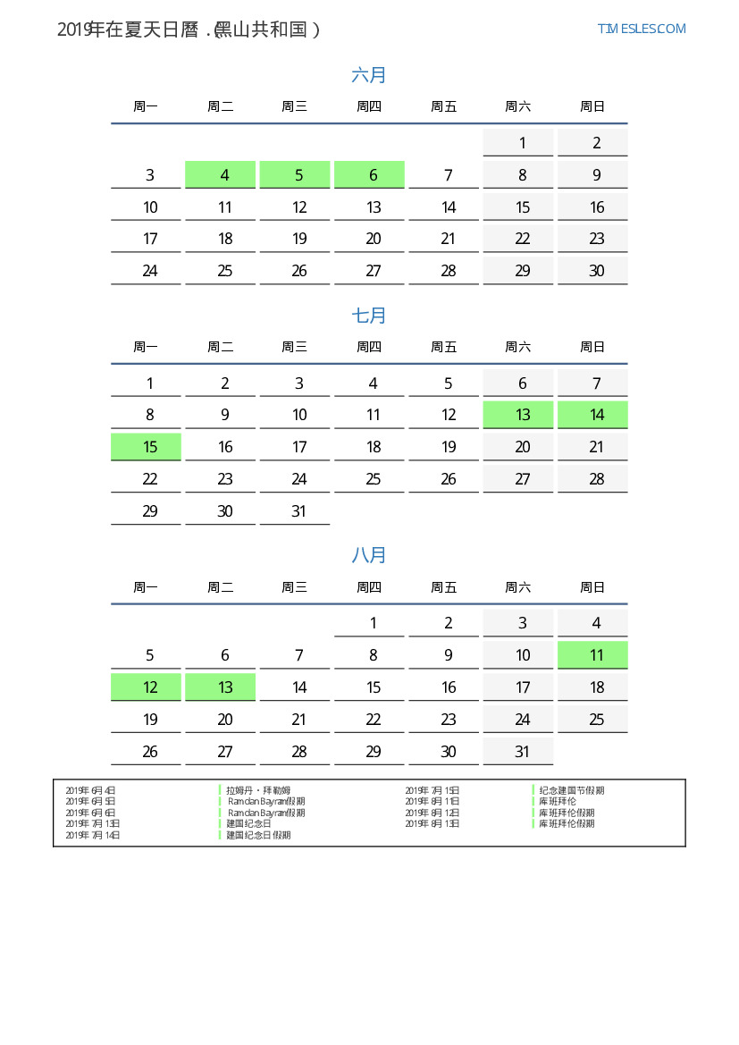 黑山共和国2019年在夏天假期和周末的日曆