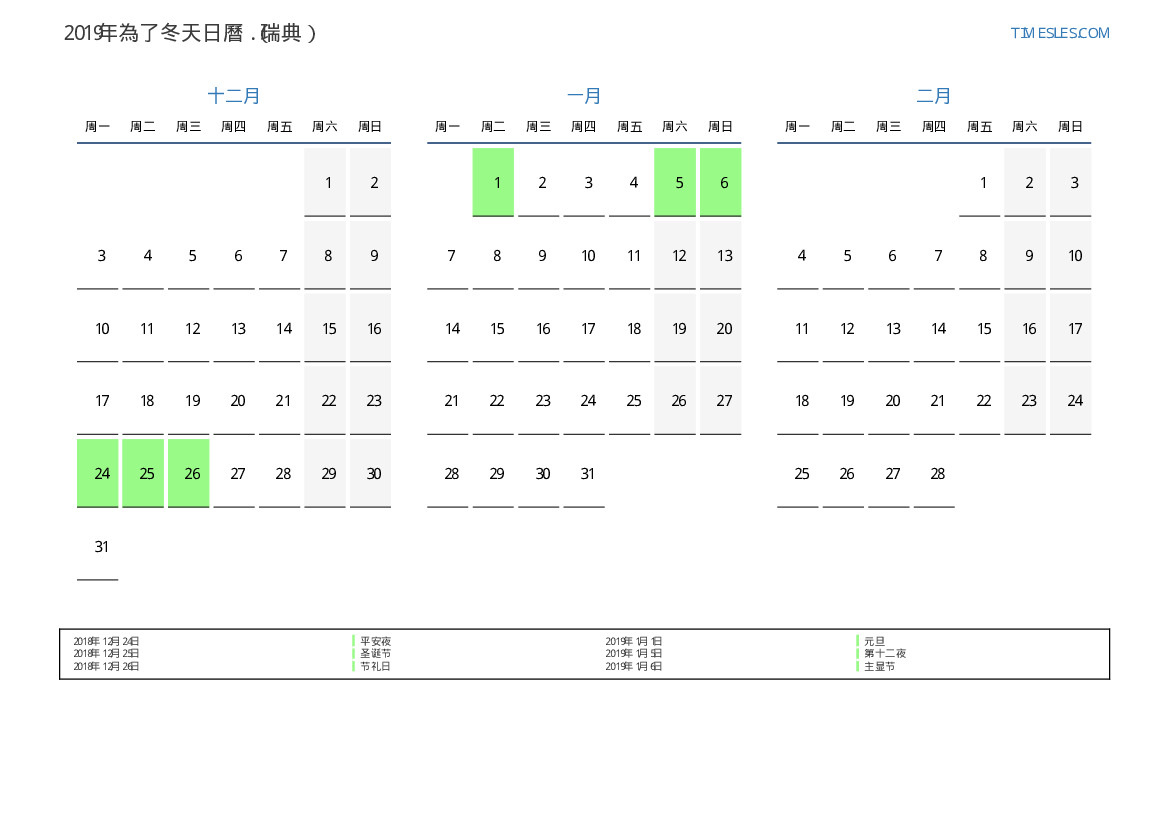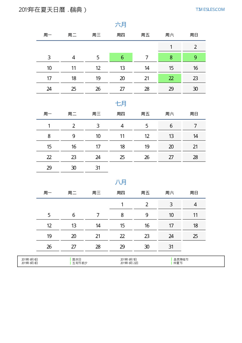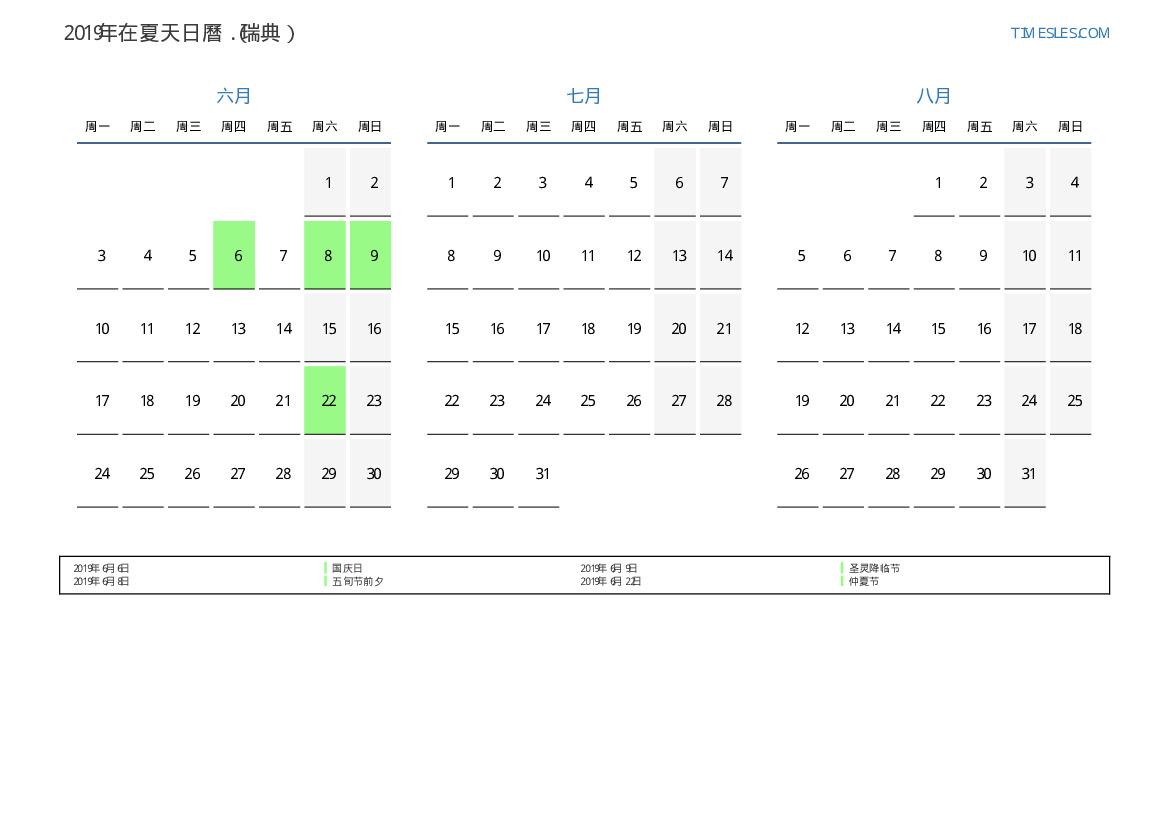 瑞典2019年在夏天假期和周末的日曆
