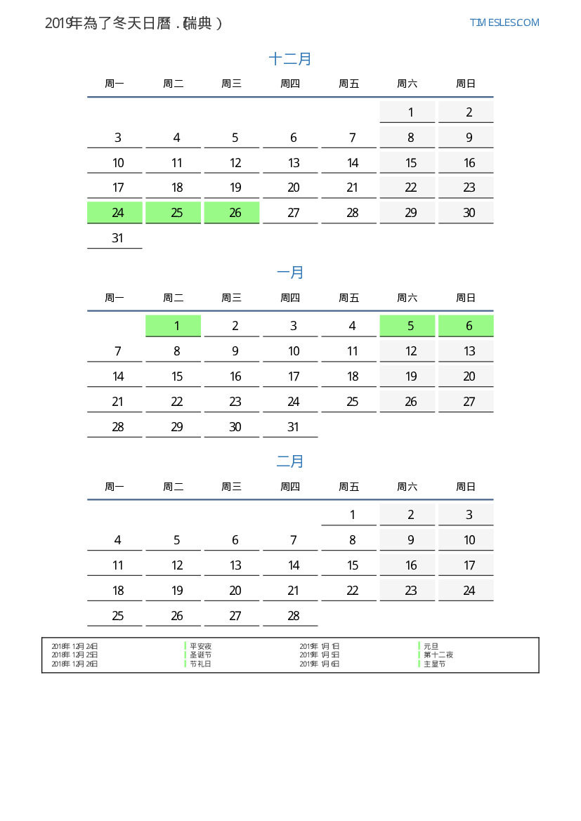 瑞典下載並打印2019年在夏天假期和周末的PDF日曆