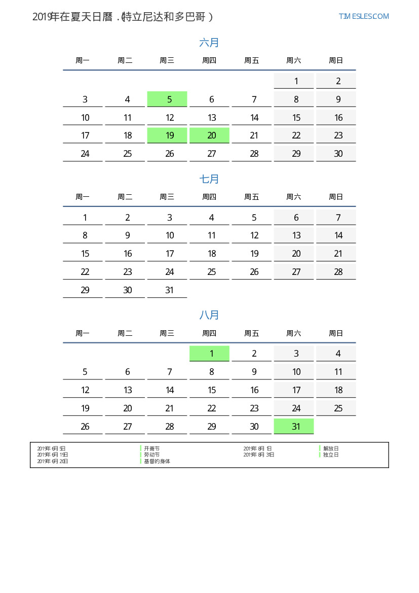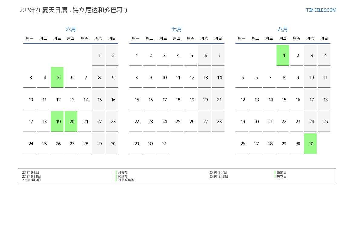 特立尼达和多巴哥下載並打印2019年在夏天假期和周末的PDF日曆
