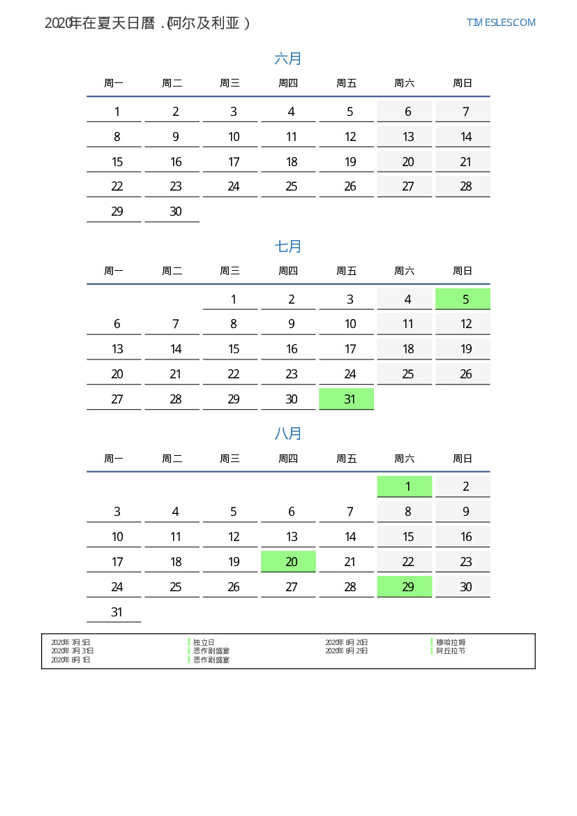 阿尔及利亚2020年在夏天日曆
