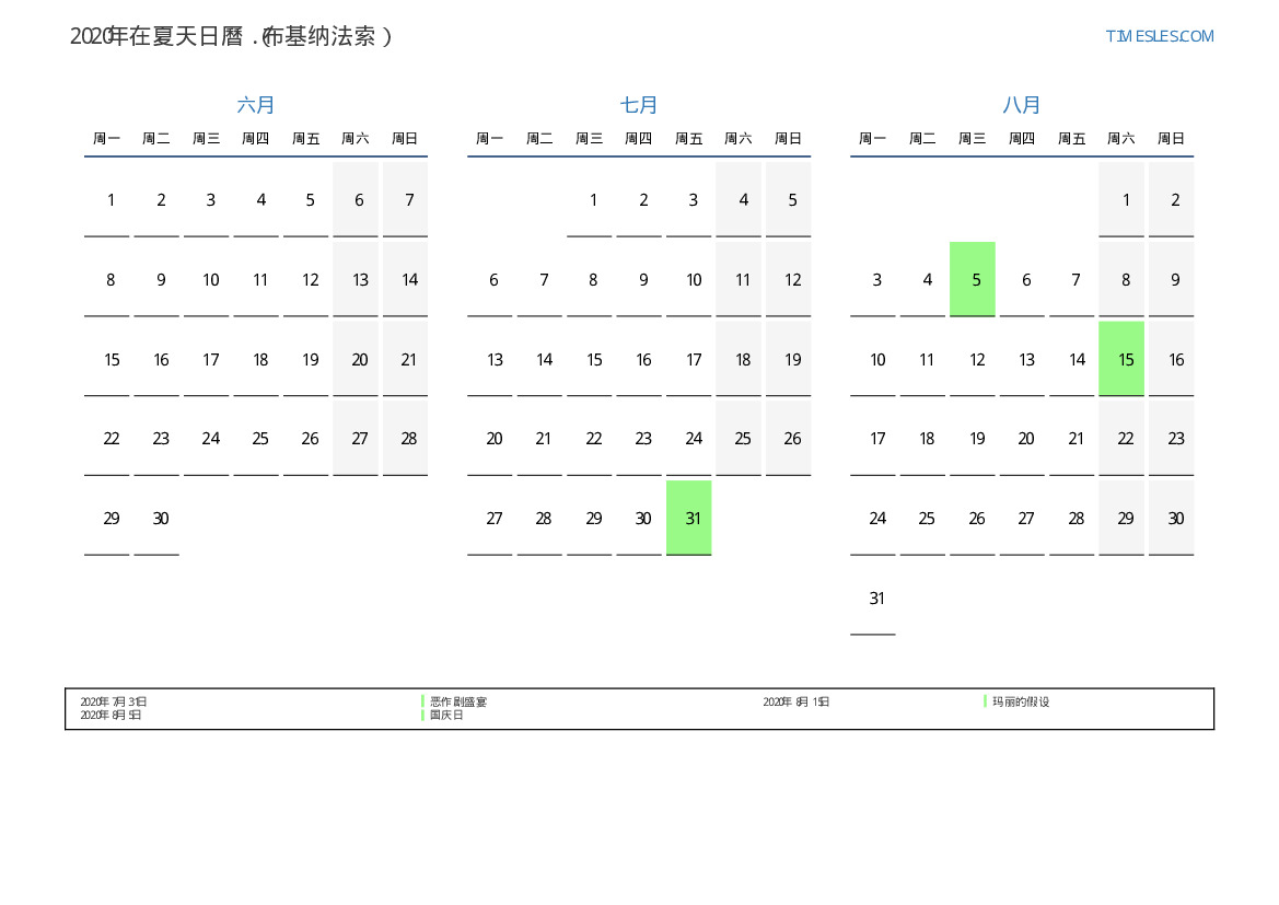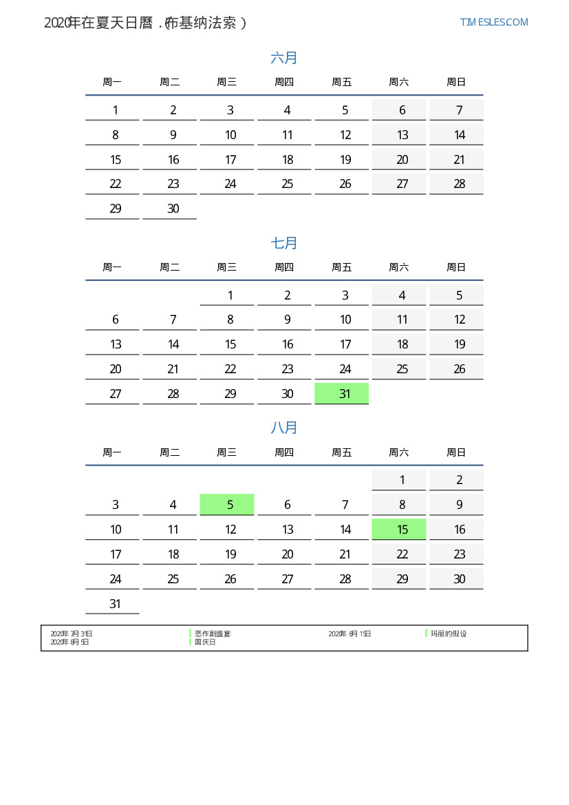 布基纳法索下載並打印2020年在夏天假期和周末的PDF日曆