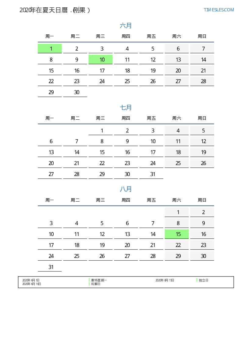 刚果下載並打印2020年在夏天假期和周末的PDF日曆