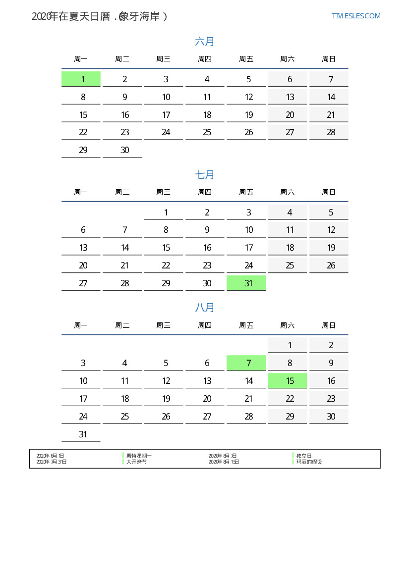 在2020年在夏天,在科特迪瓦有5 假期和休假。 2020年在夏天週一開始,週一結束。