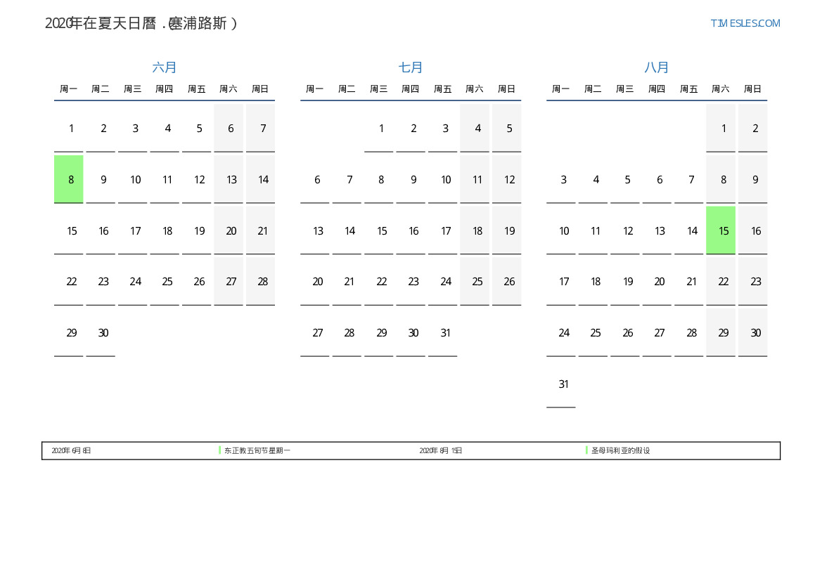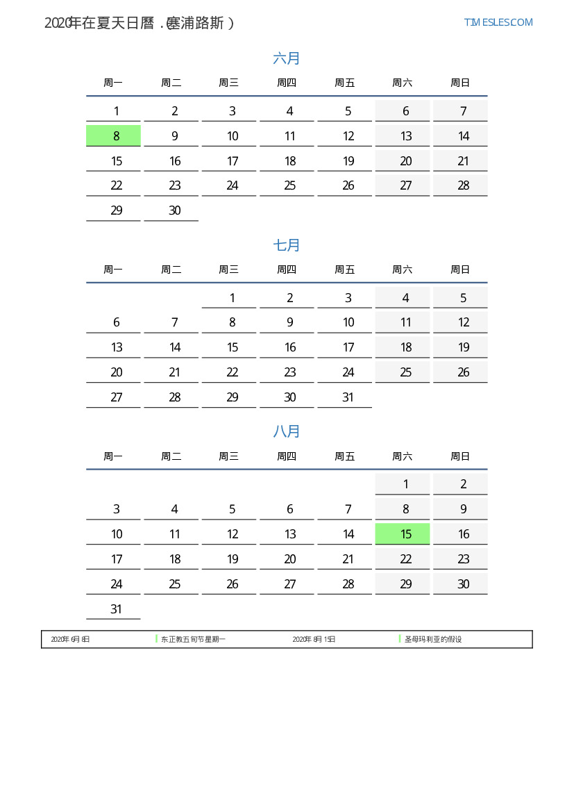 塞浦路斯2020年在夏天假期和周末的日曆
