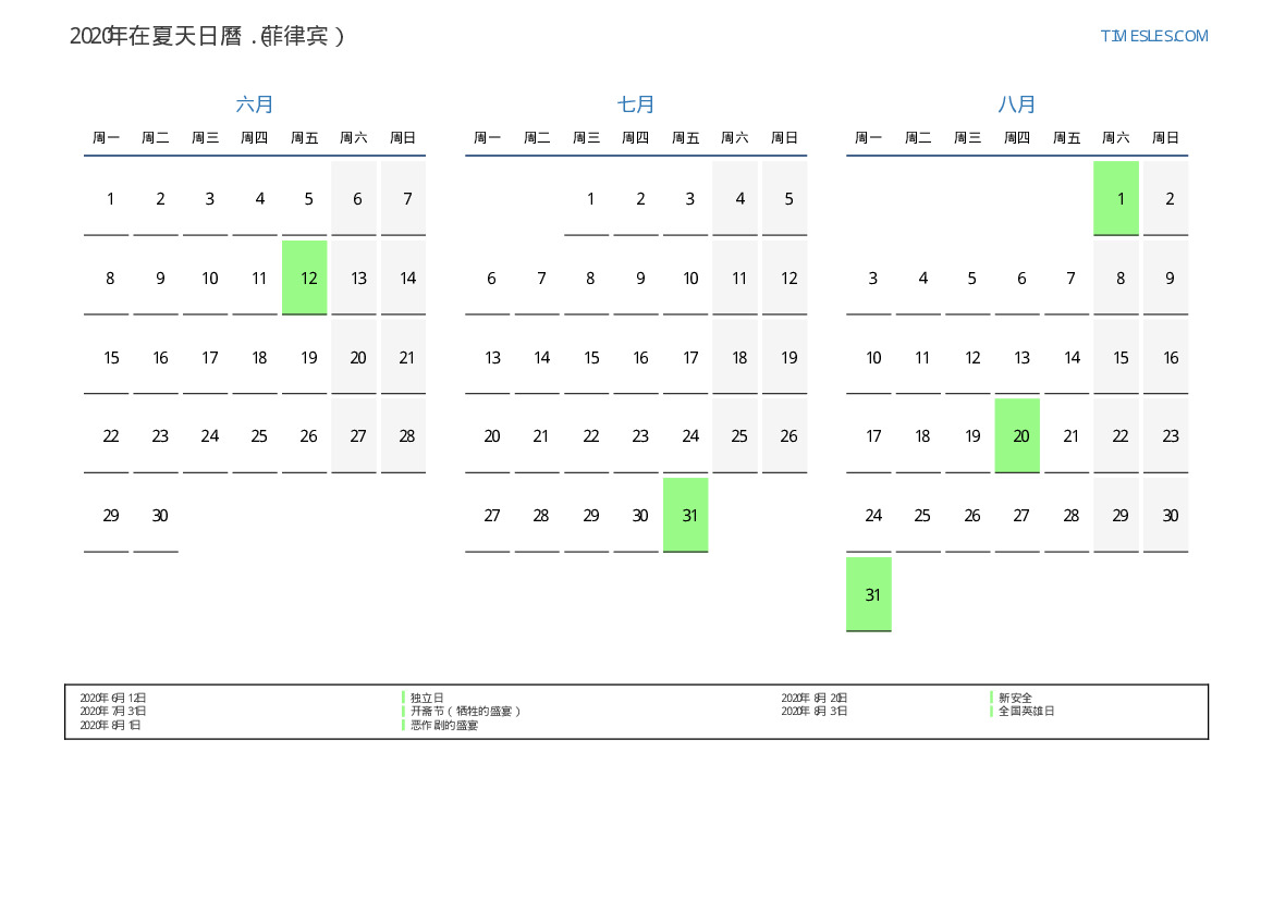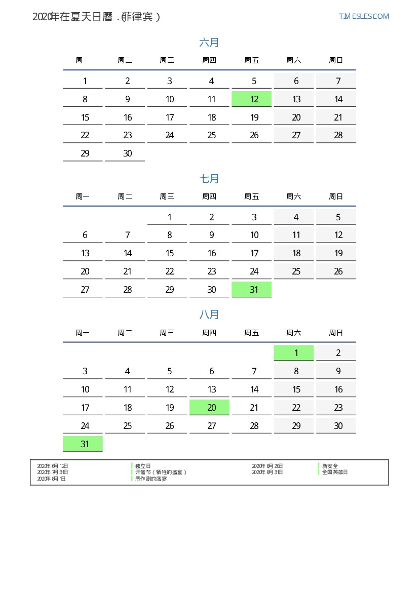 菲律宾下載並打印2020年在夏天假期和周末的PDF日曆