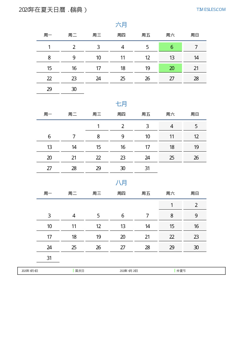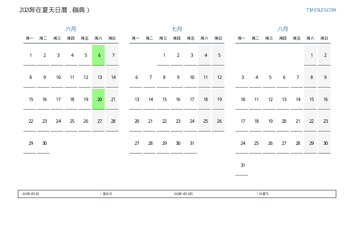 瑞典下載並打印2020年在夏天假期和周末的PDF日曆