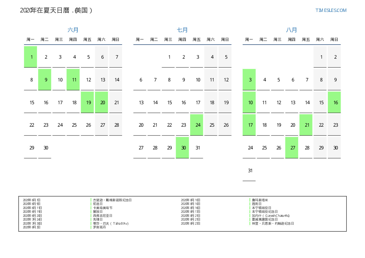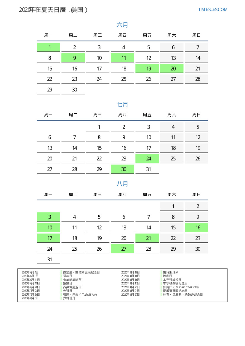 美国2020年在夏天假期和周末的日曆
