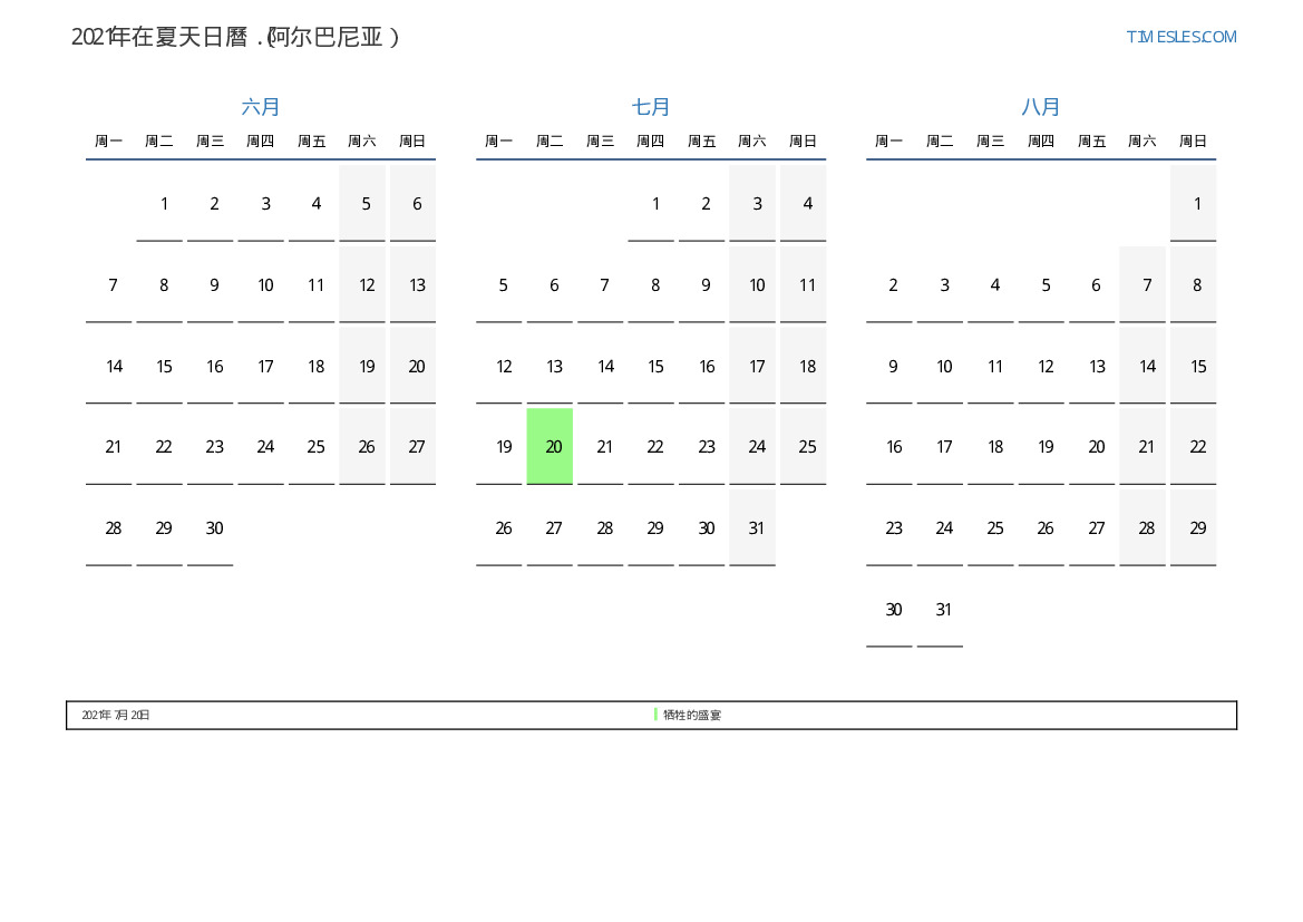 阿尔巴尼亚2021年在夏天假期和周末的日曆