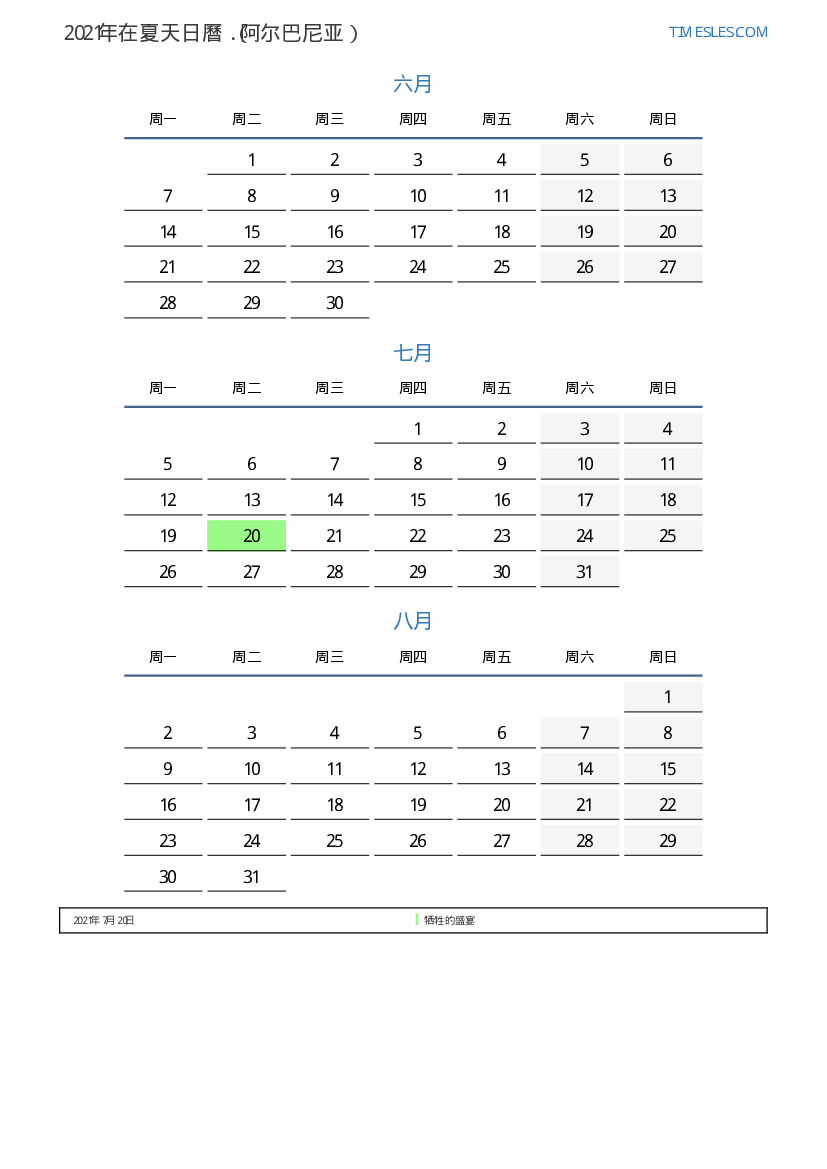 阿尔巴尼亚下載並打印2021年在夏天假期和周末的PDF日曆