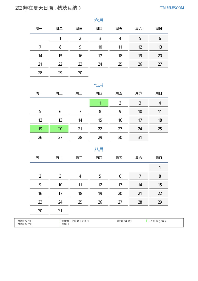 博茨瓦纳2021年在夏天假期和周末的日曆