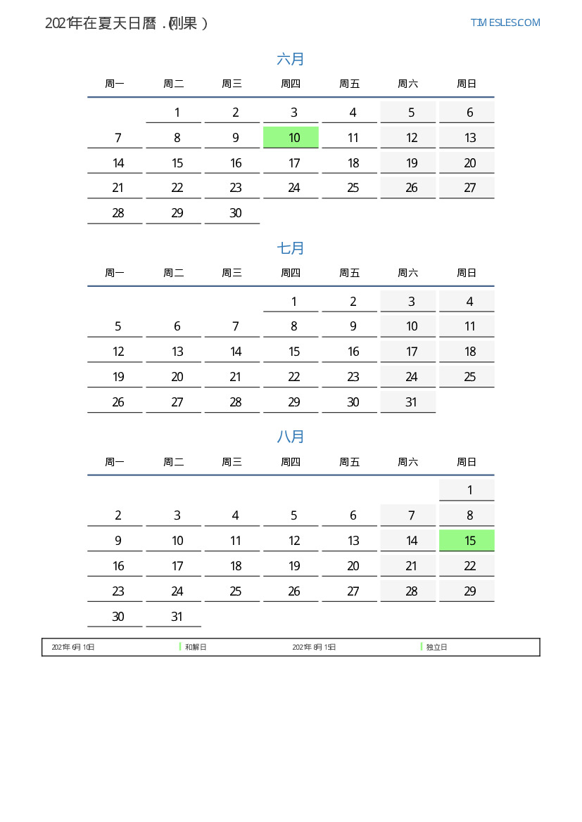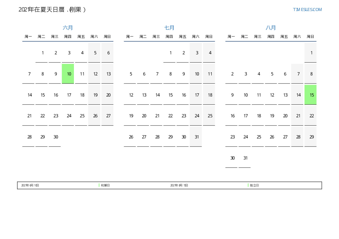 刚果下載並打印2021年在夏天假期和周末的PDF日曆