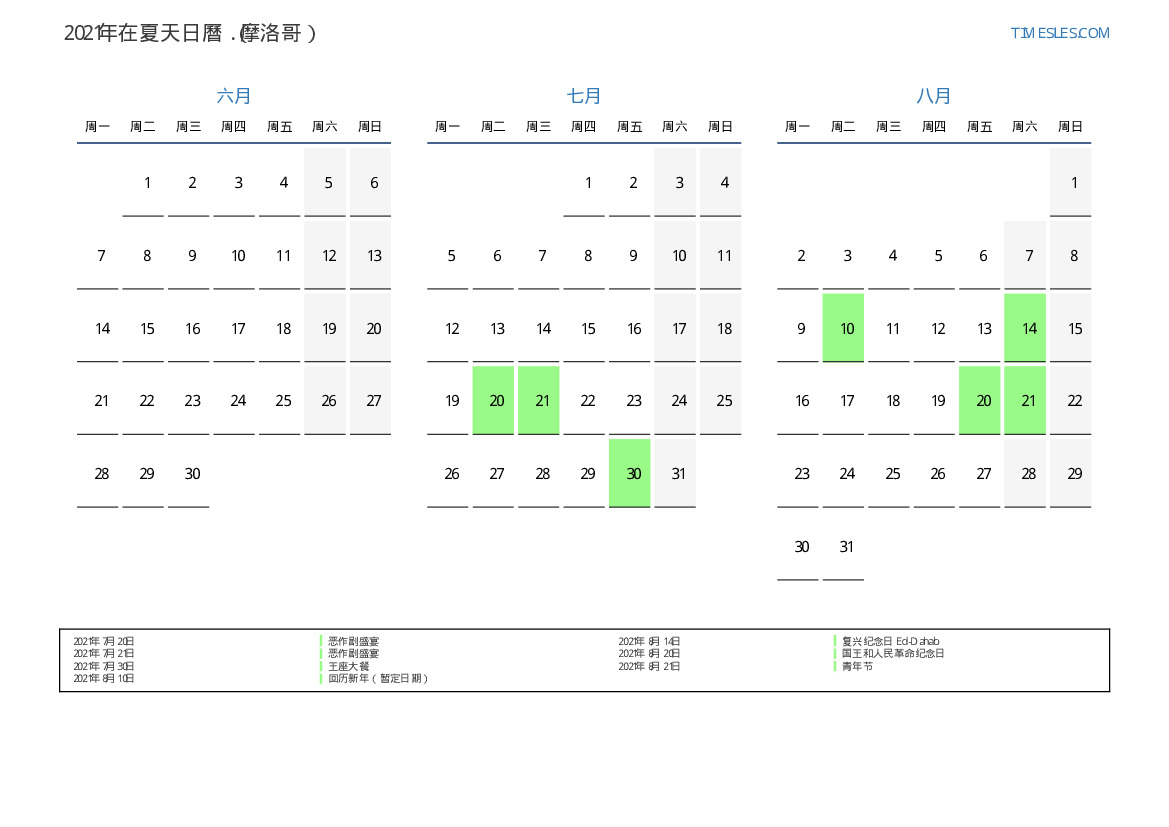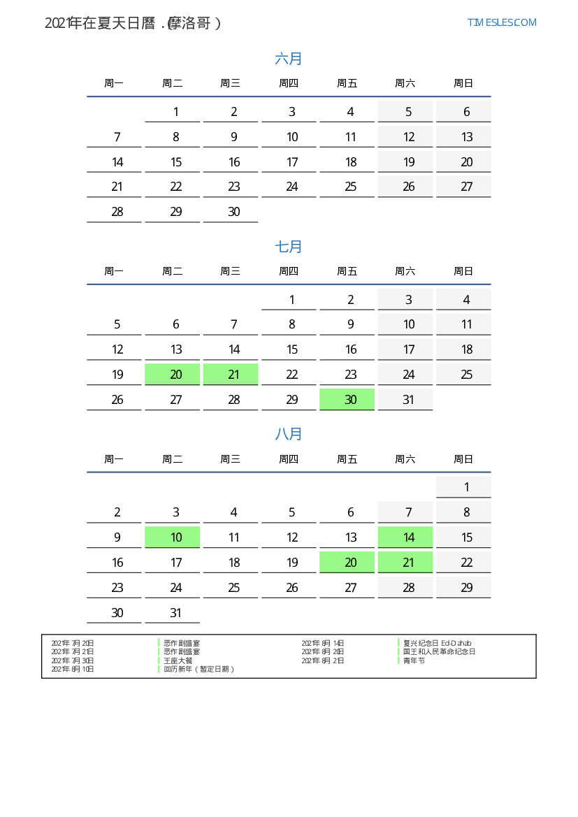 摩洛哥2021年在夏天假期和周末的日曆