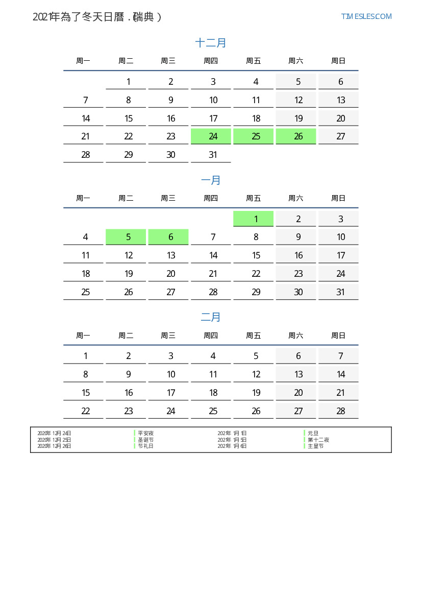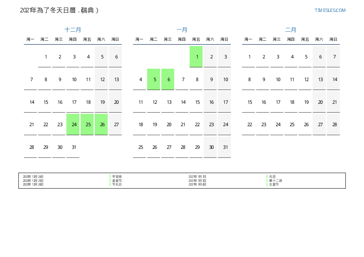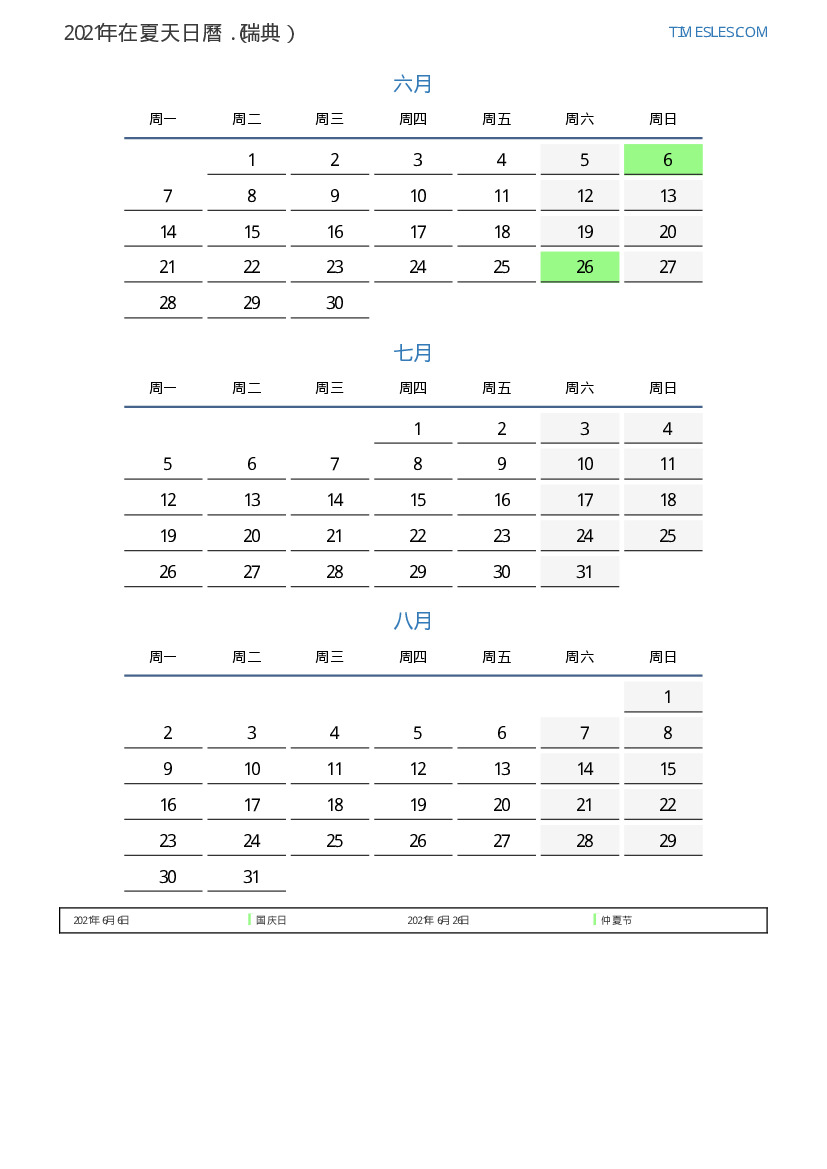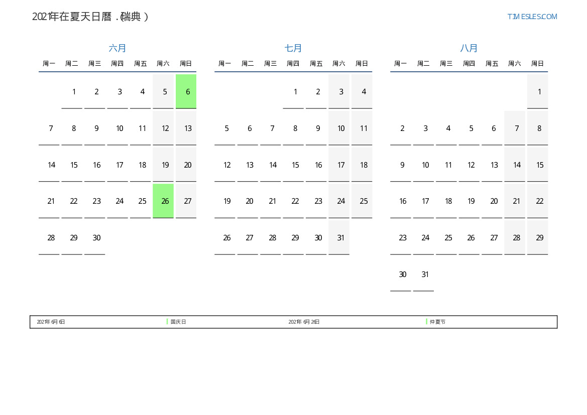 瑞典下載並打印2021年在夏天假期和周末的PDF日曆