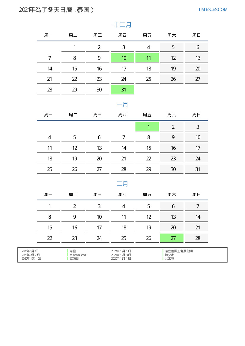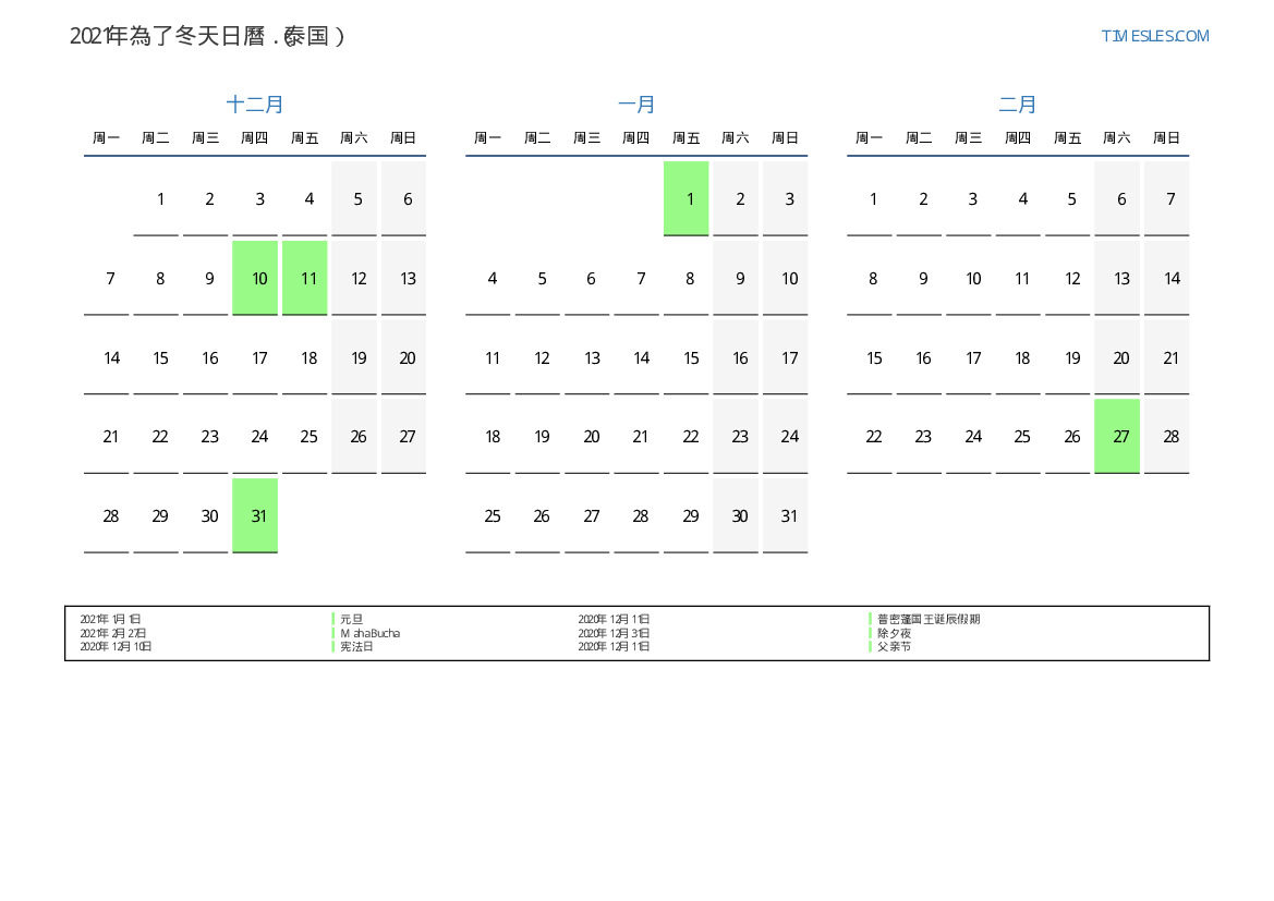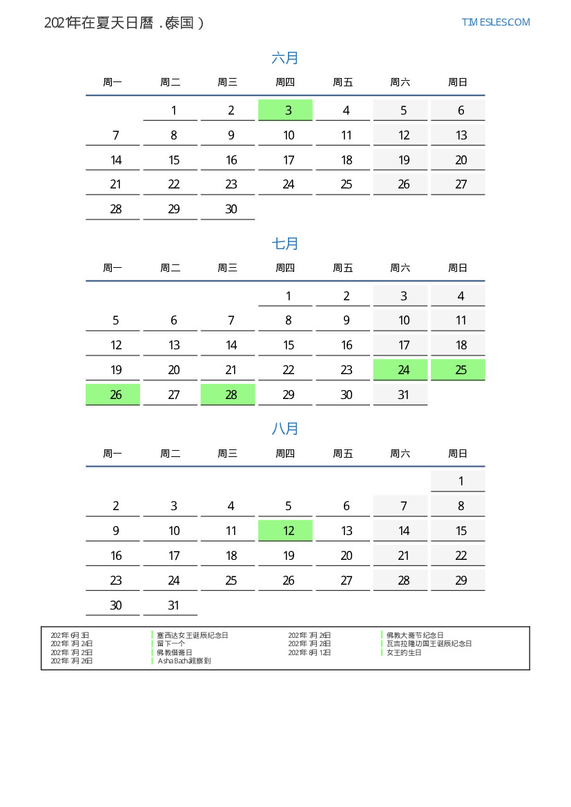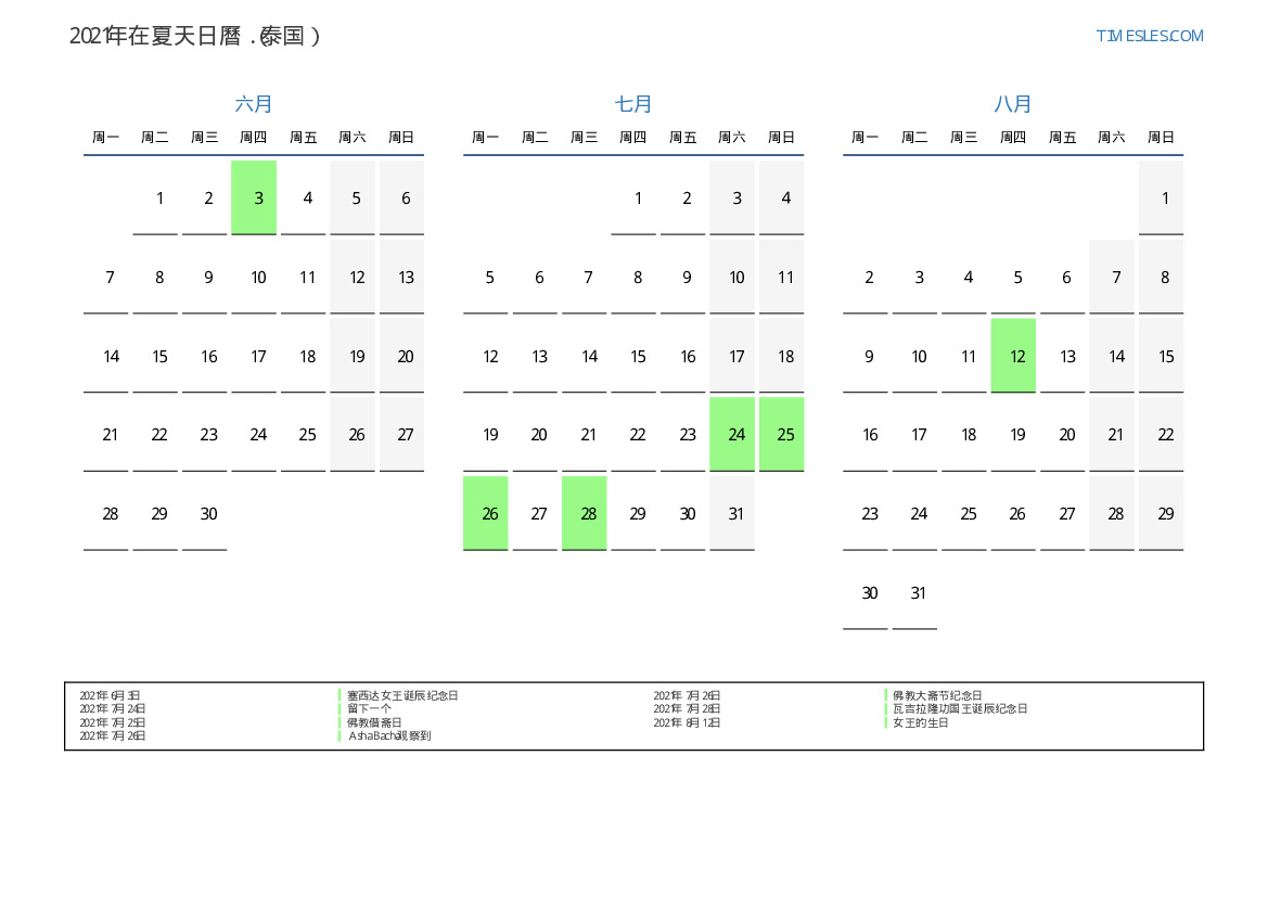 为泰国下載並打印2021年在夏天假期和周末的PDF日曆
