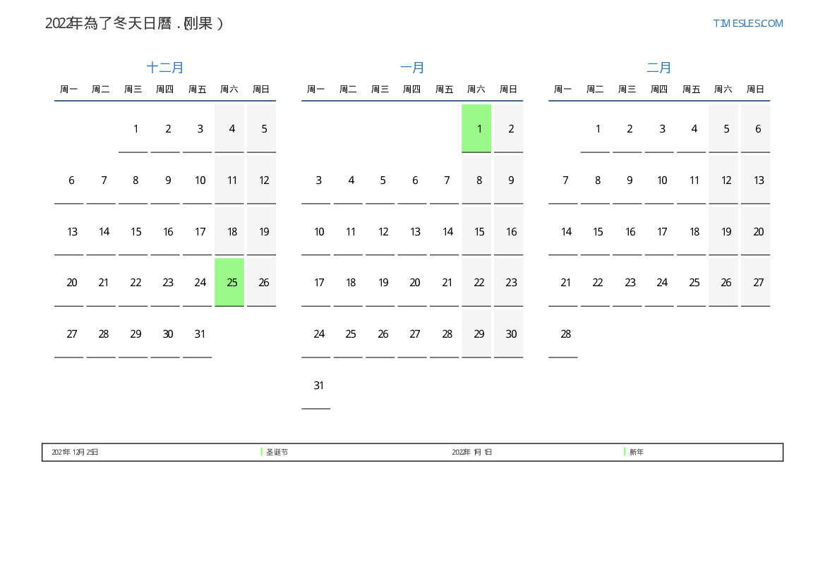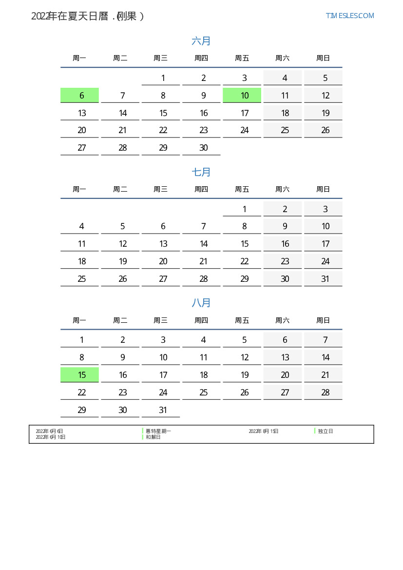 刚果下載並打印2022年在夏天假期和周末的PDF日曆