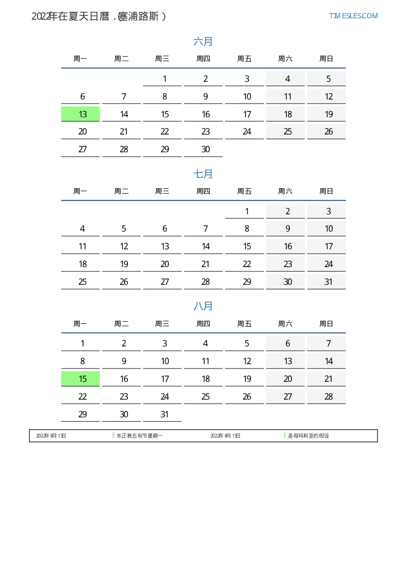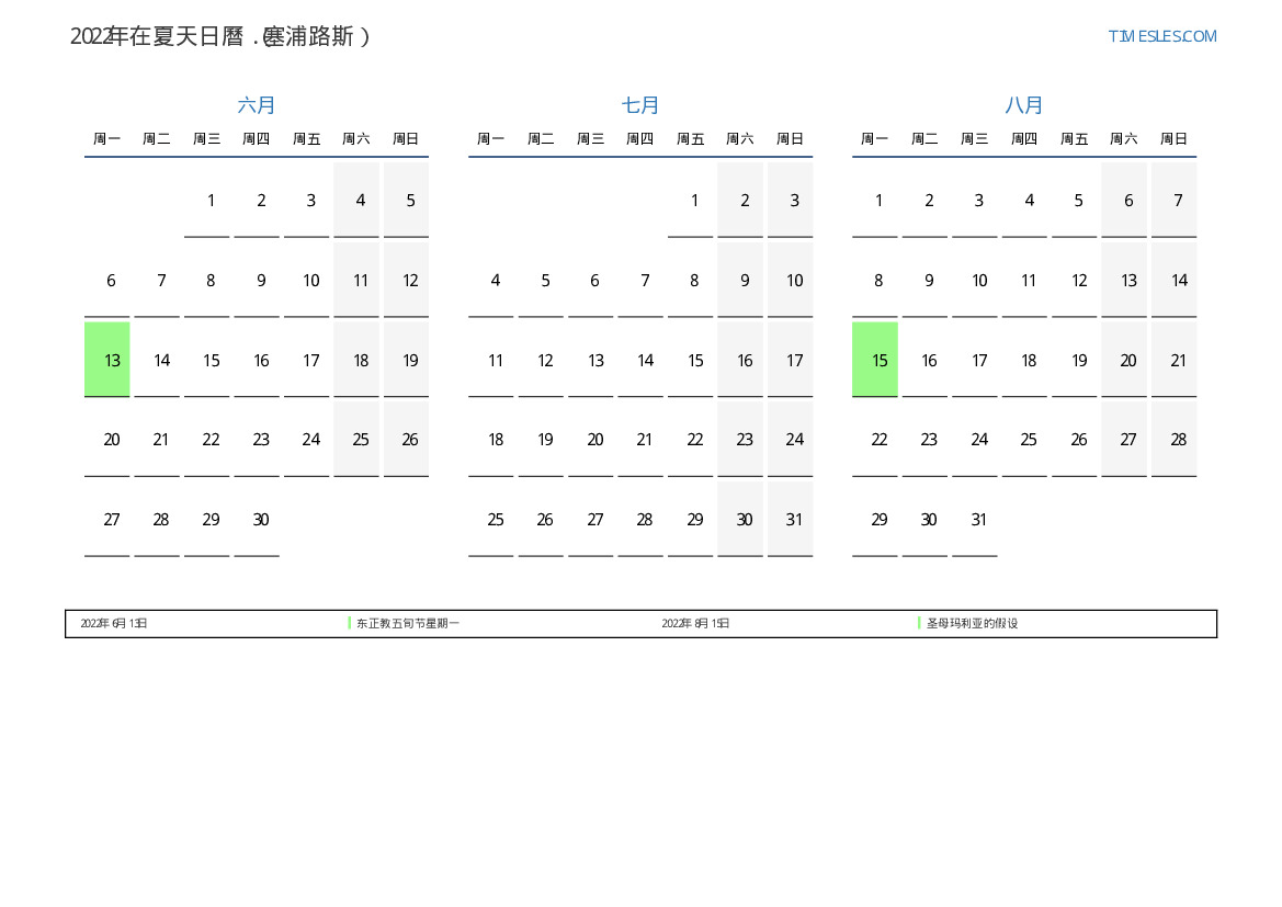 塞浦路斯下載並打印2022年在夏天假期和周末的PDF日曆