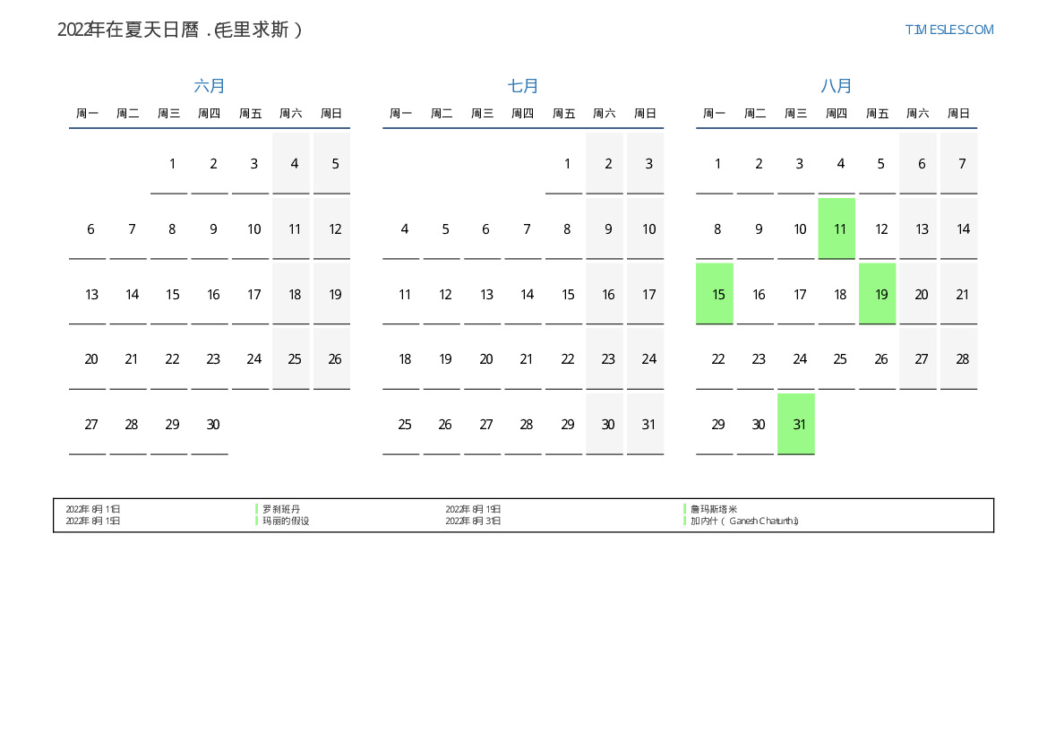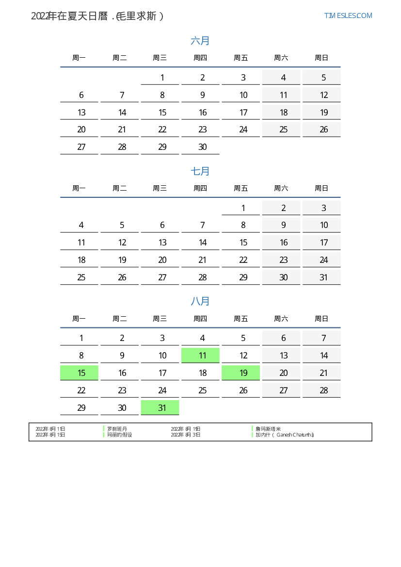 毛里求斯下載並打印2022年在夏天假期和周末的PDF日曆