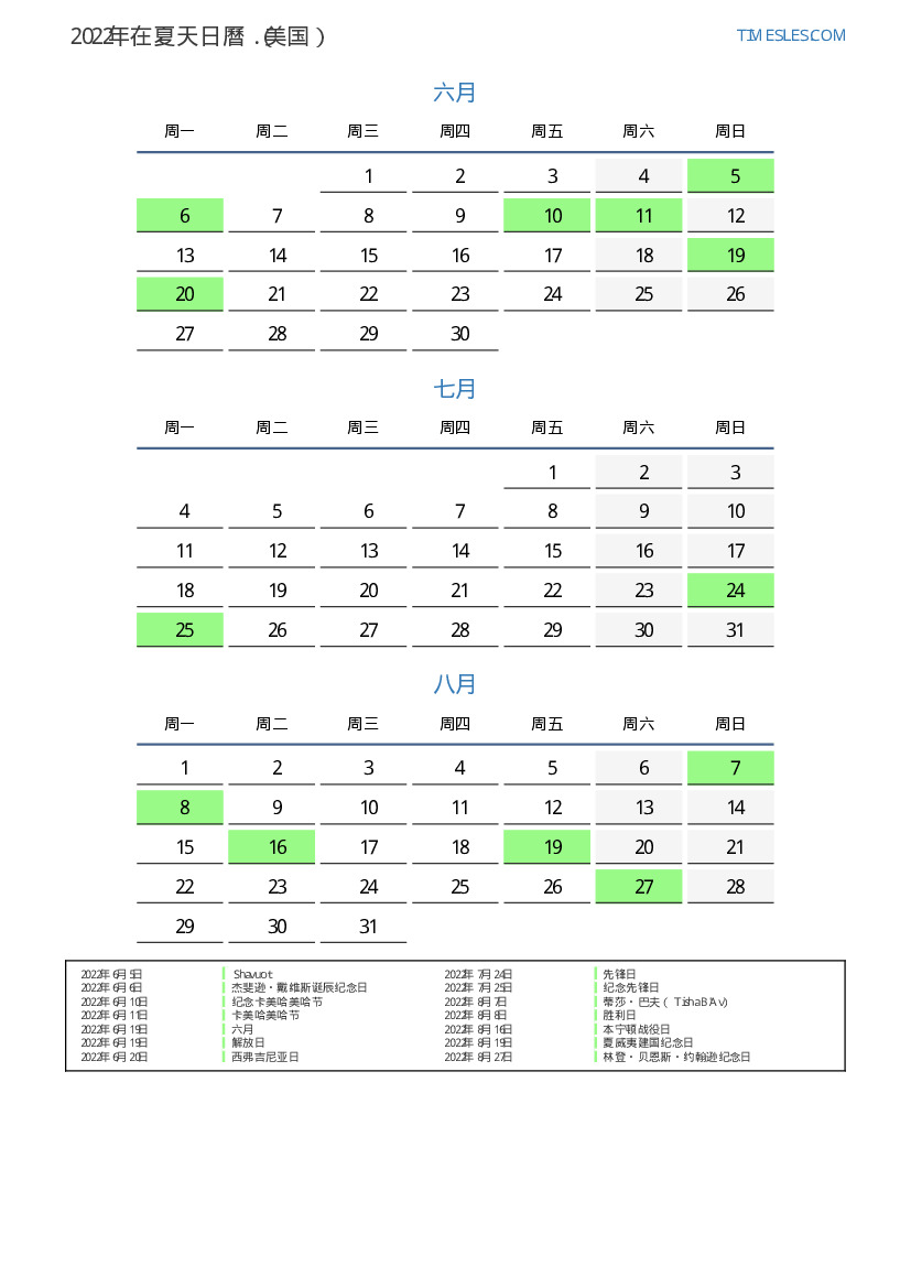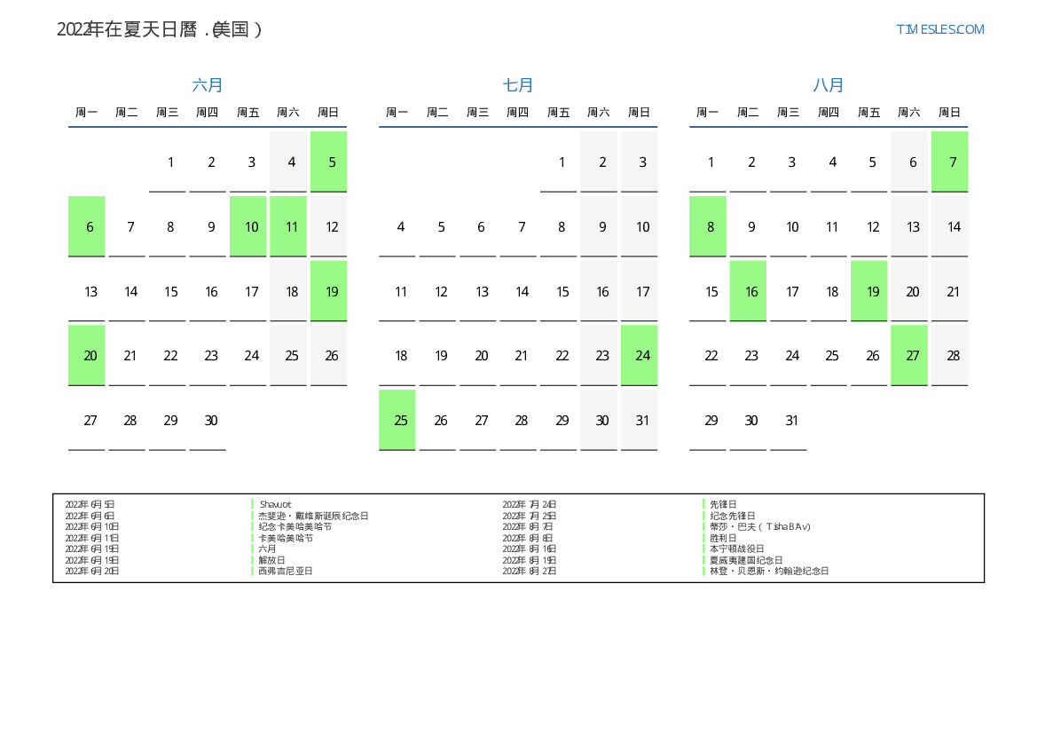 美国下載並打印2022年在夏天假期和周末的PDF日曆