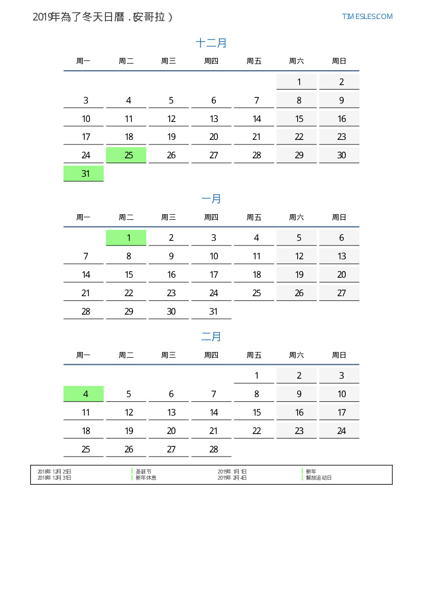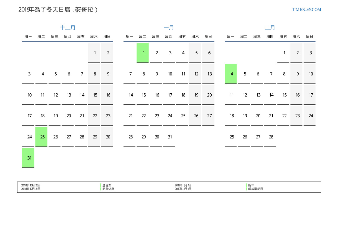 为安哥拉2019年為了冬天假期和周末的日曆