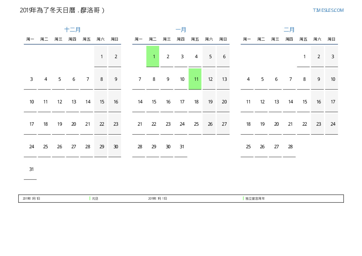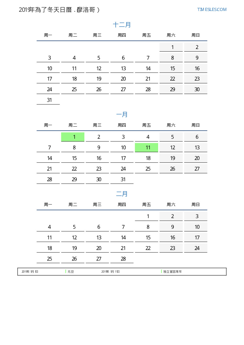 摩洛哥下載並打印2019年為了冬天假期和周末的PDF日曆