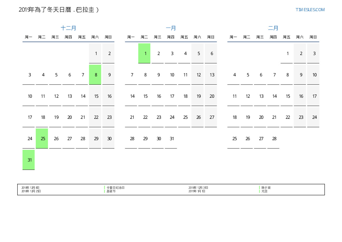 巴拉圭下載並打印2019年為了冬天假期和周末的PDF日曆