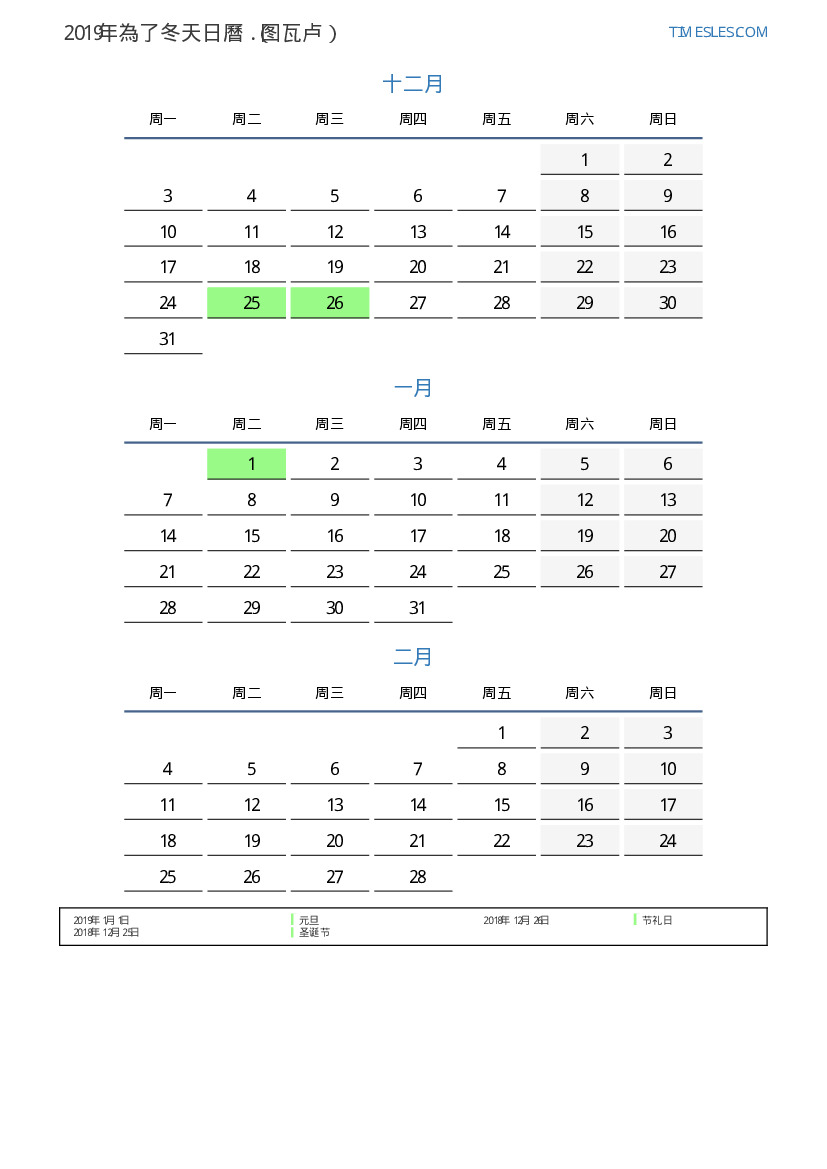 对于图瓦卢2019年為了冬天假期和周末的日曆