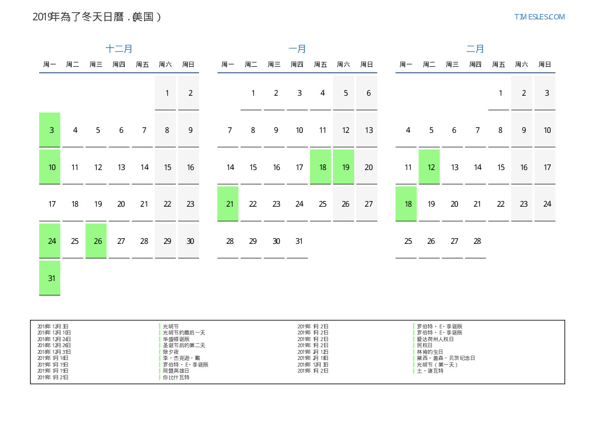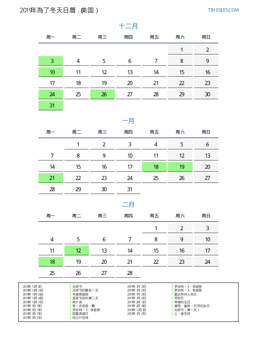 美国下載並打印2019年為了冬天假期和周末的PDF日曆