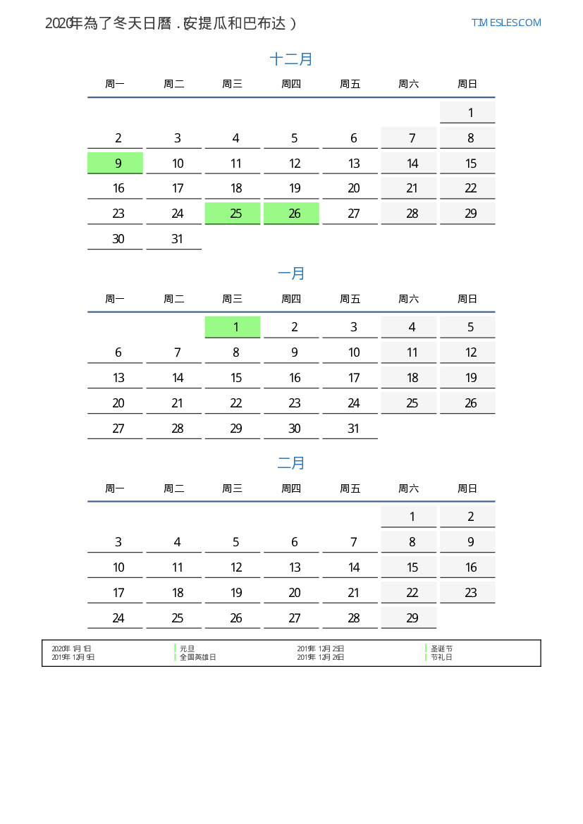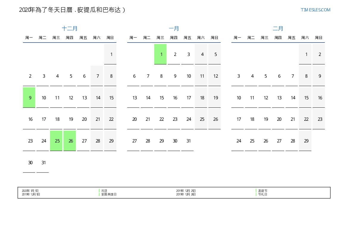 安提瓜和巴布达2020年為了冬天假期和周末的日曆