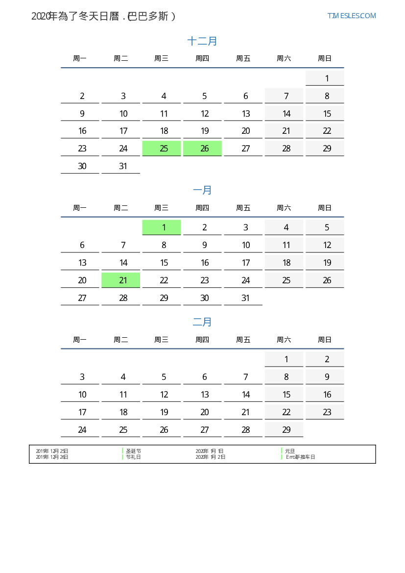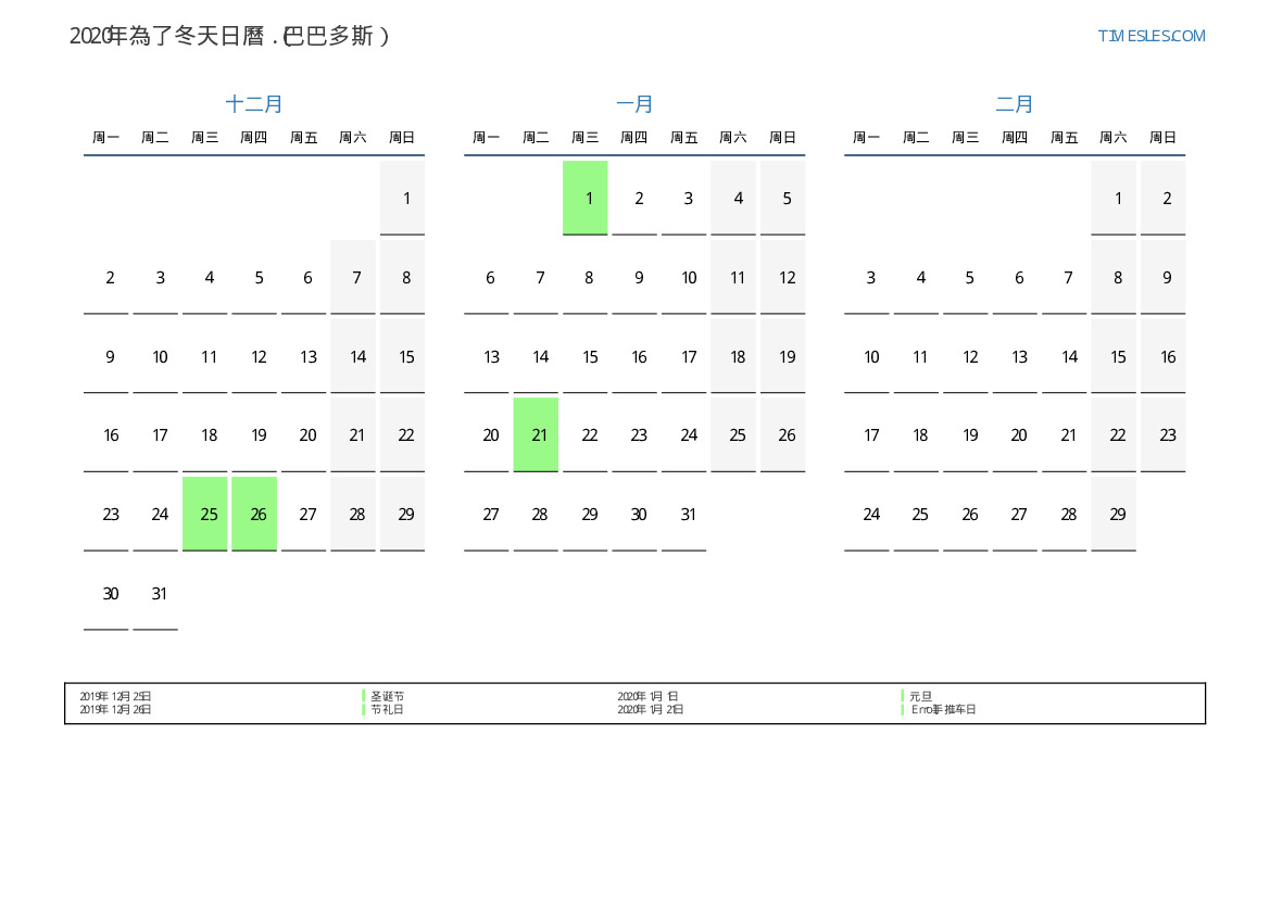 巴巴多斯2020年為了冬天假期和周末的日曆