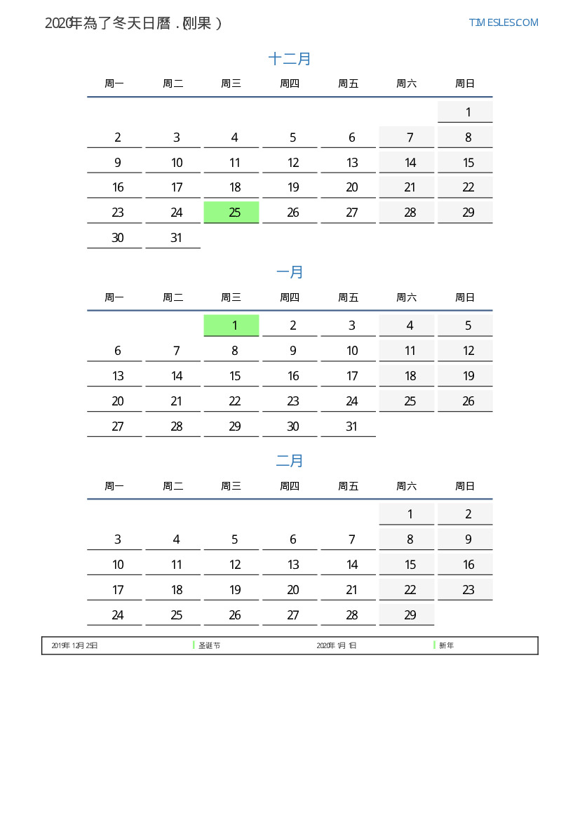 刚果下載並打印2020年為了冬天假期和周末的PDF日曆