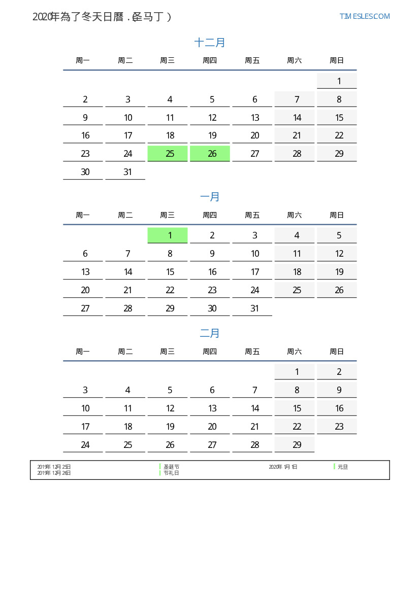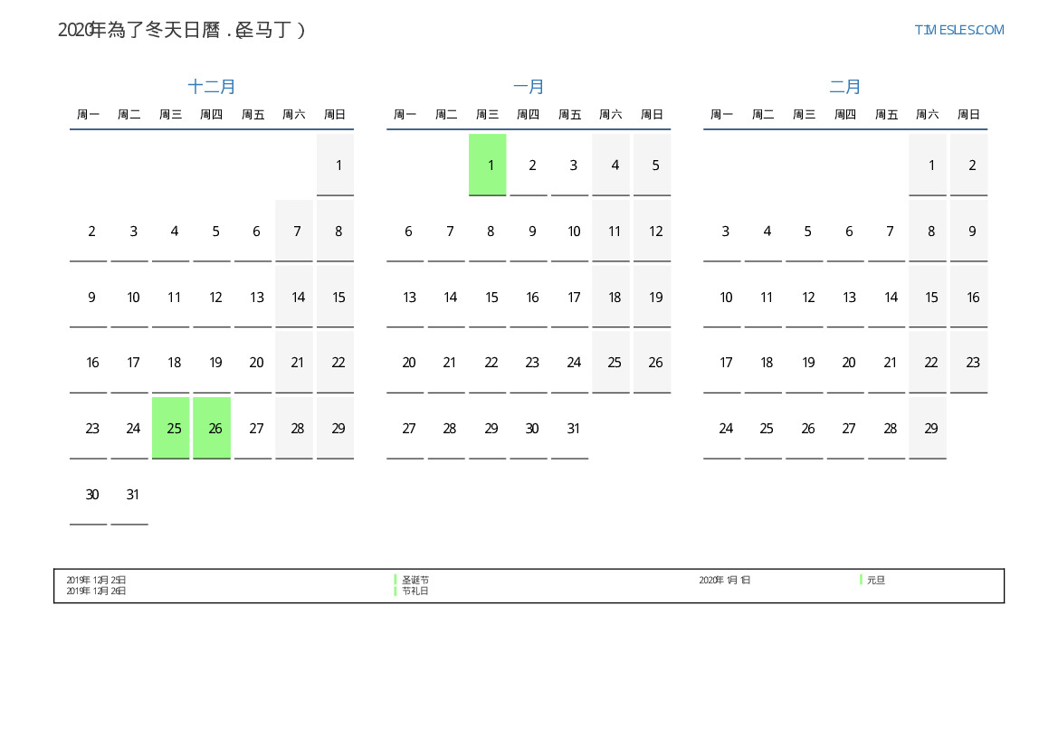 为圣马丁下載並打印2020年為了冬天假期和周末的PDF日曆