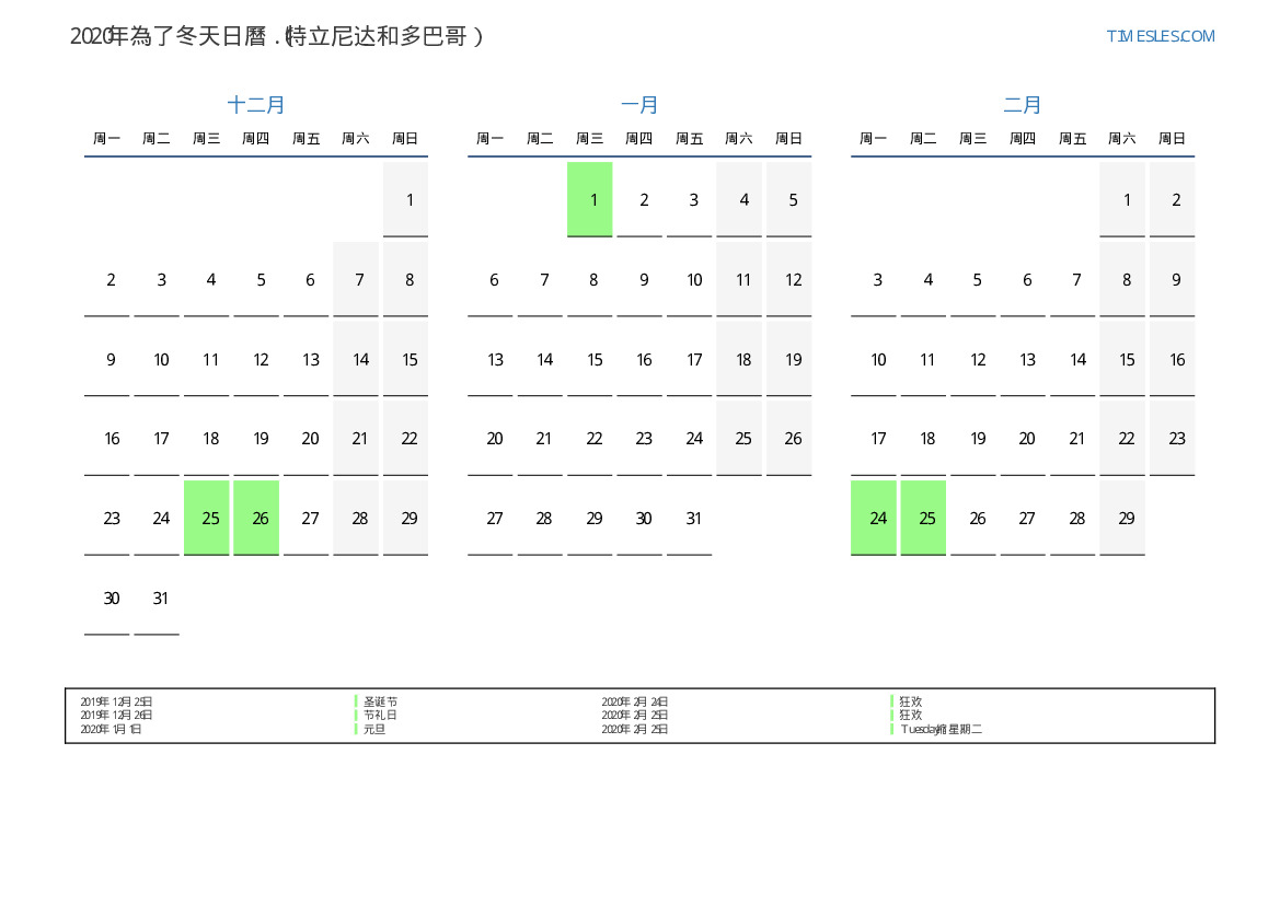 特立尼达和多巴哥下載並打印2020年為了冬天假期和周末的PDF日曆