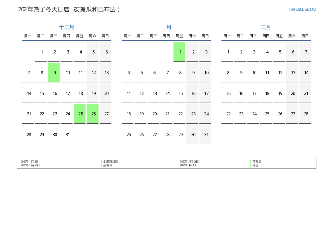 安提瓜和巴布达2021年為了冬天假期和周末的日曆